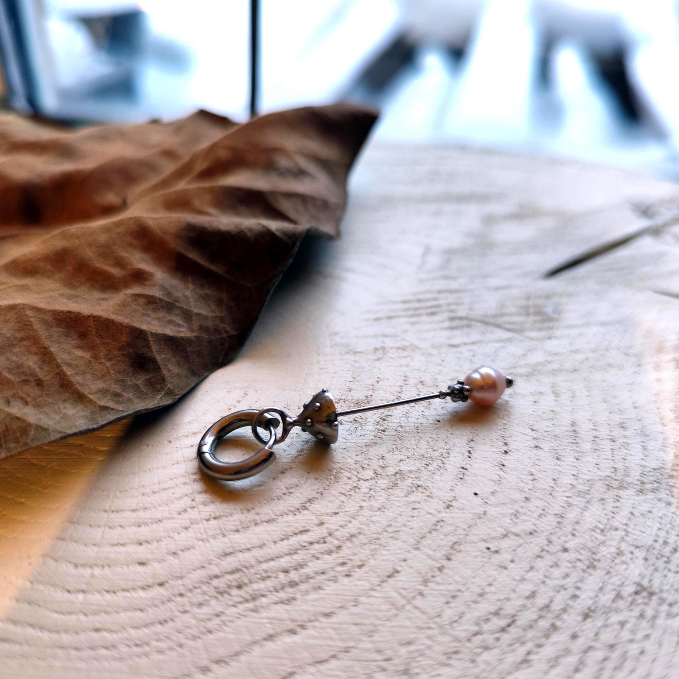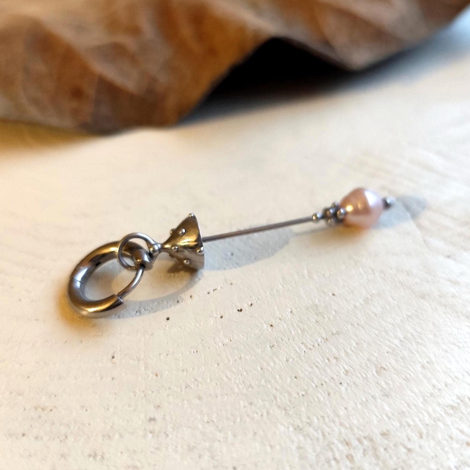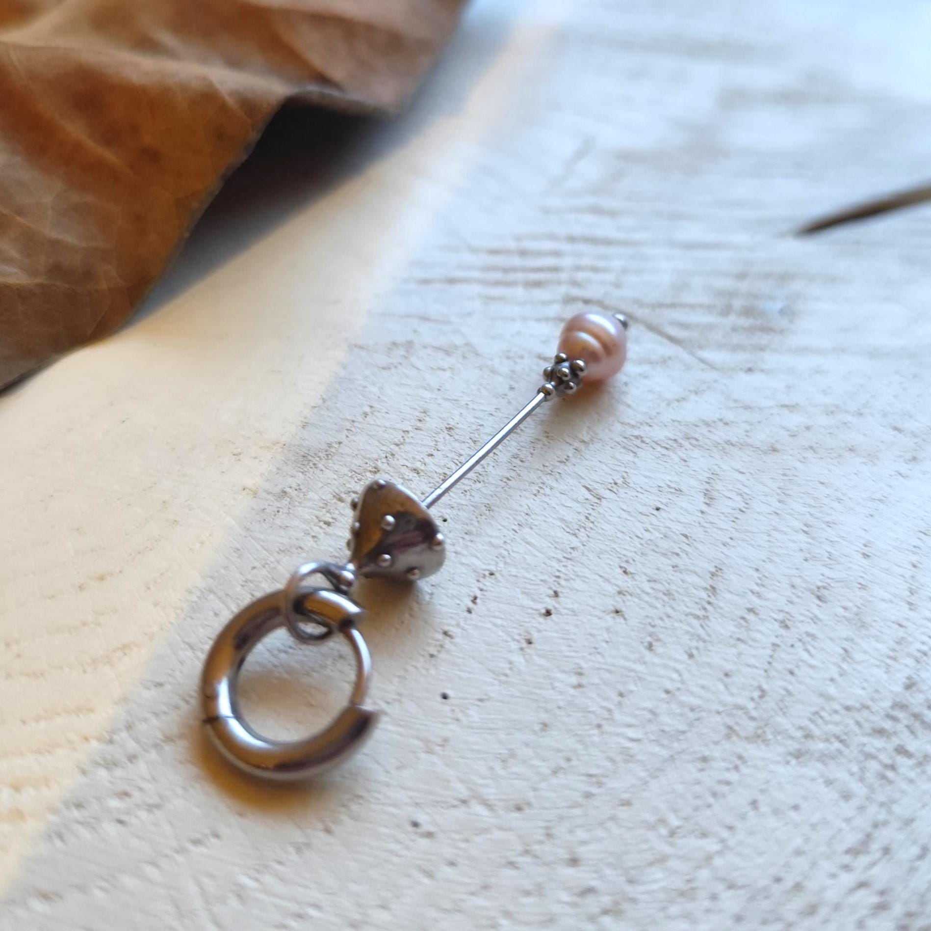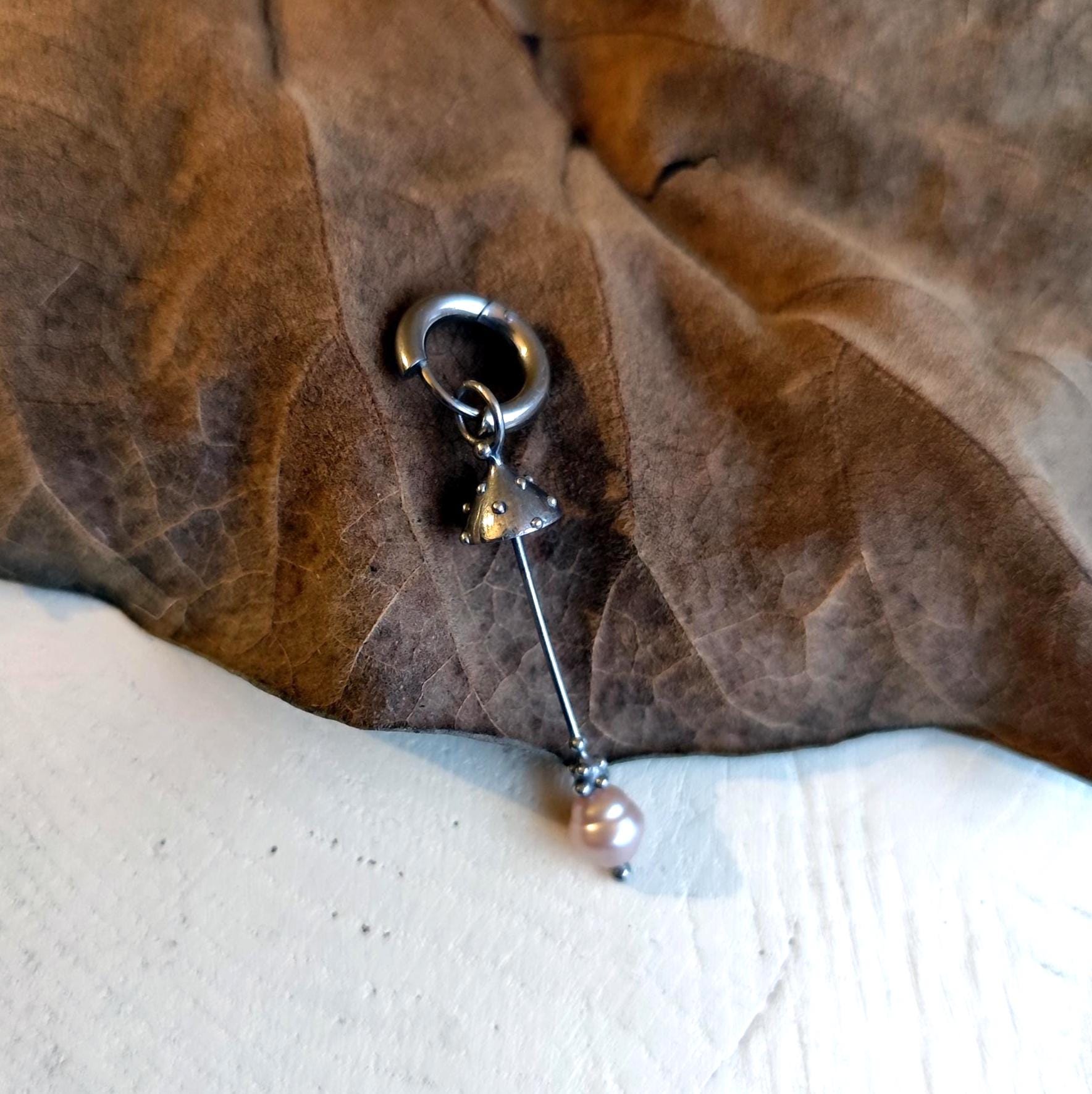 Handcrafted metal earring ring shaped like fungi amanita from copper, pewter, steel and pearl. Treated with antioxidant, sanded, polished. Light and sturdy fly agaric pendant. All elements are handmade, which ensures the individuality of each product made in the Yadovito workshop. The copper alloy is polished with a finishing solution to give the jewelry a noble appearance and at the same time so that the metal does not oxidize. Size about 4.5/0.8 cm (1.7 * 0.4 in). Color silver/white.