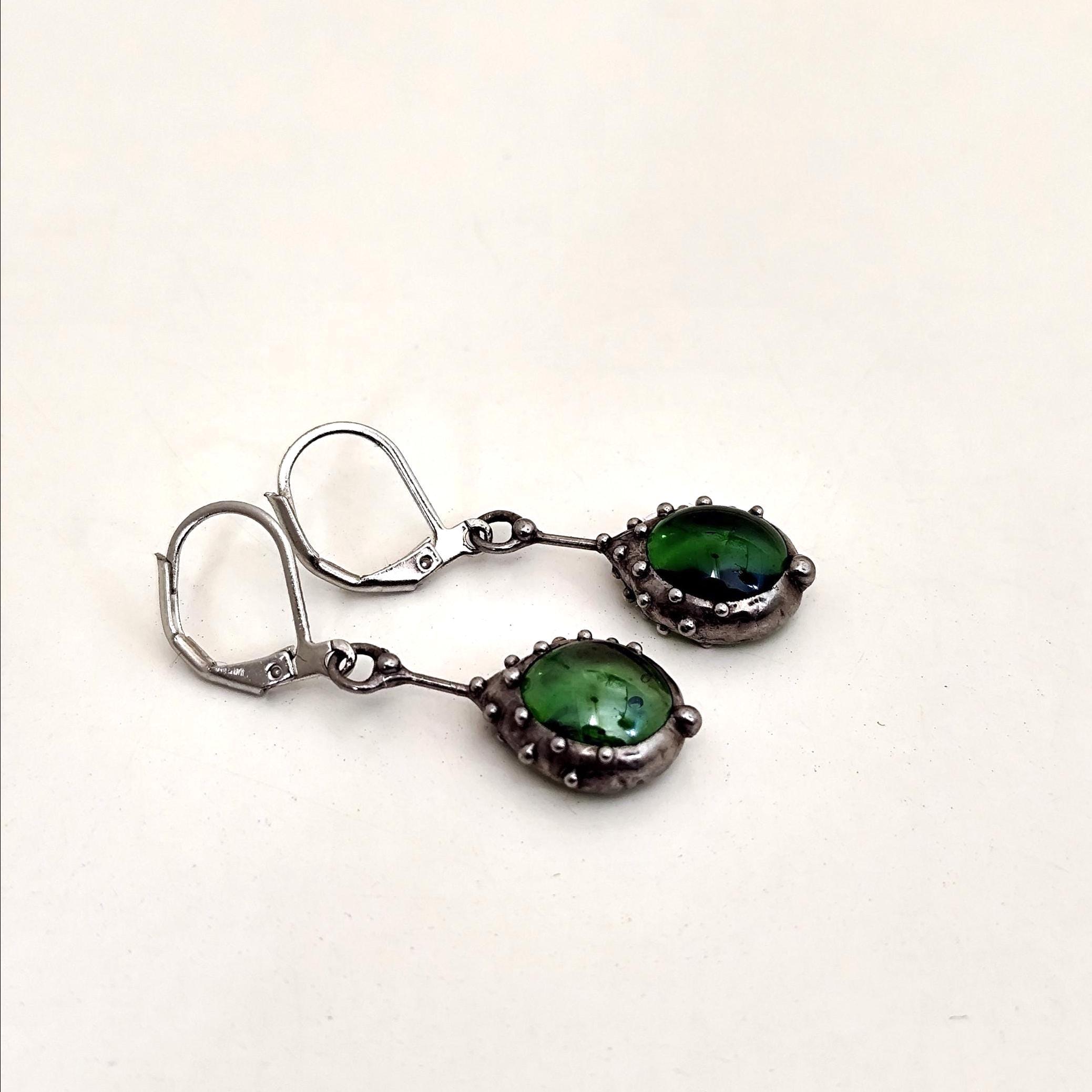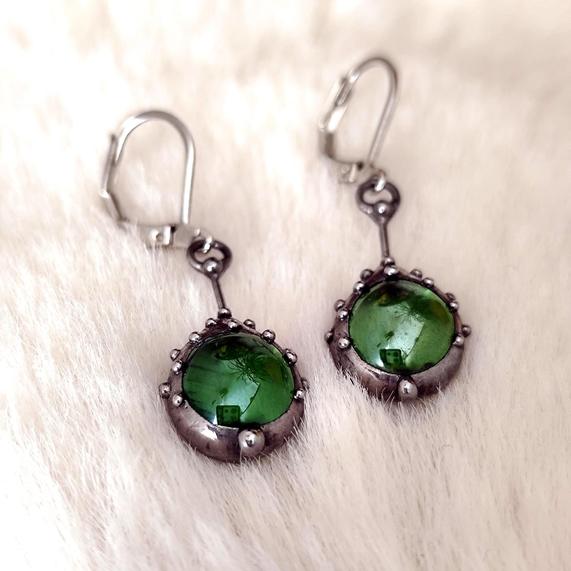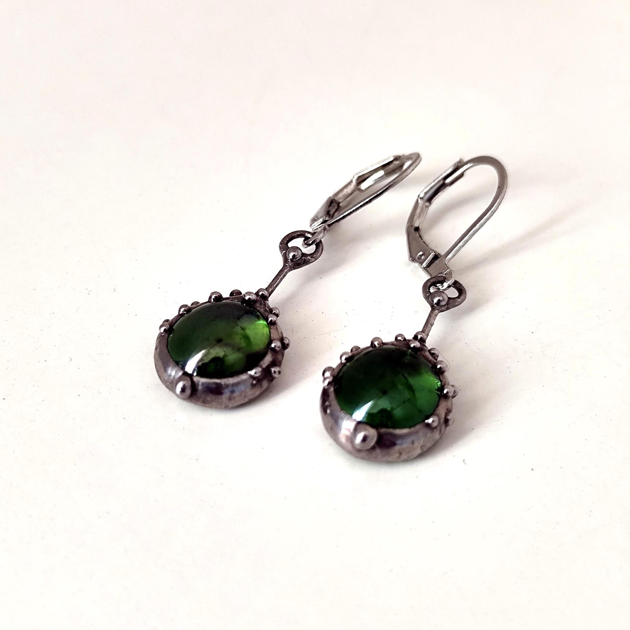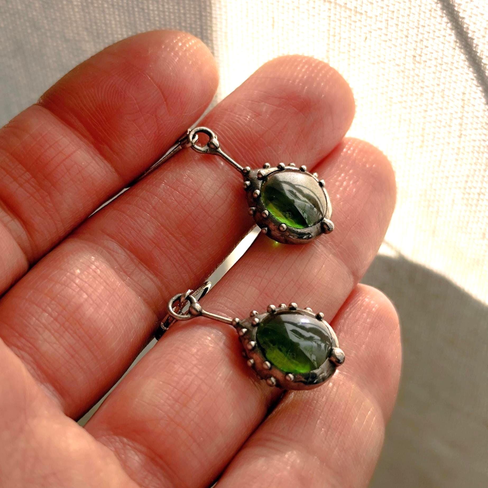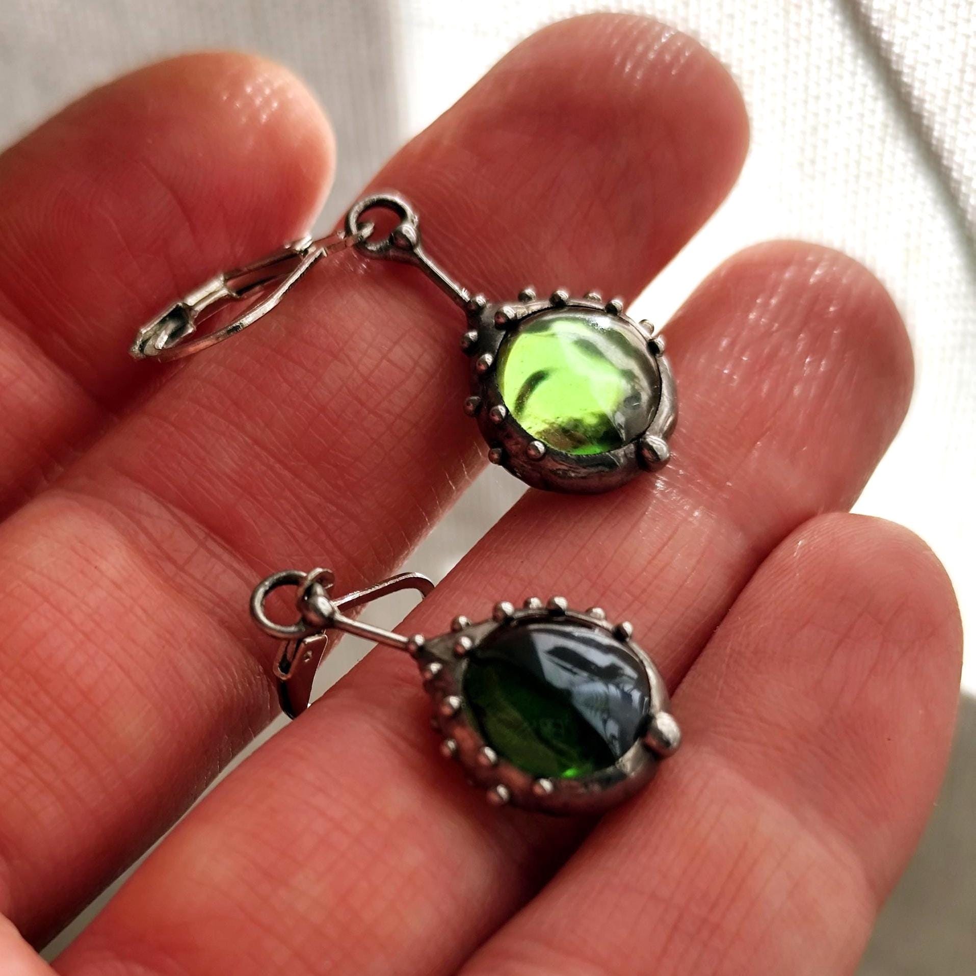 Stained glass minimalist simple geometry jewelry green earrings handcrafted from copper, steel, pewter, green glass. Treated with antioxidant, sanded, polished. Simple and sturdy handmade green glass suncatchers earrings. All elements are handmade, which ensures the individuality of each product made in the Yadovito workshop. The copper alloy is polished with a finishing solution to give the jewelry a noble appearance and at the same time so that the metal does not oxidize. Earrings use glass melted in a special furnace. After melting, the glass takes on an almost unique shape and amazing color. Color: silver/green. 2.5 * 1.3 cm (1 * 0.5 in).