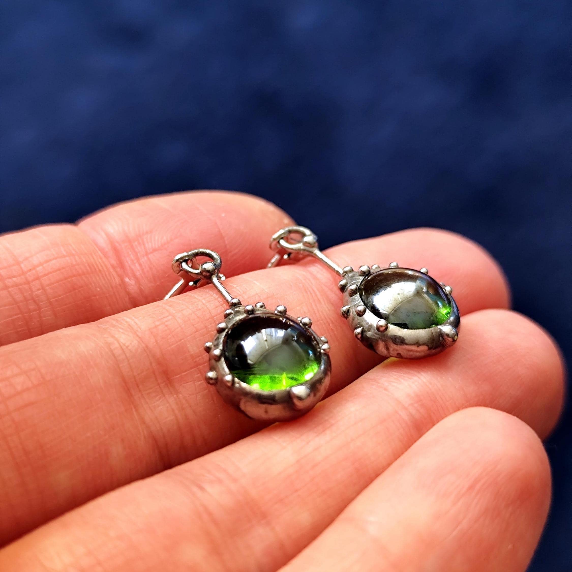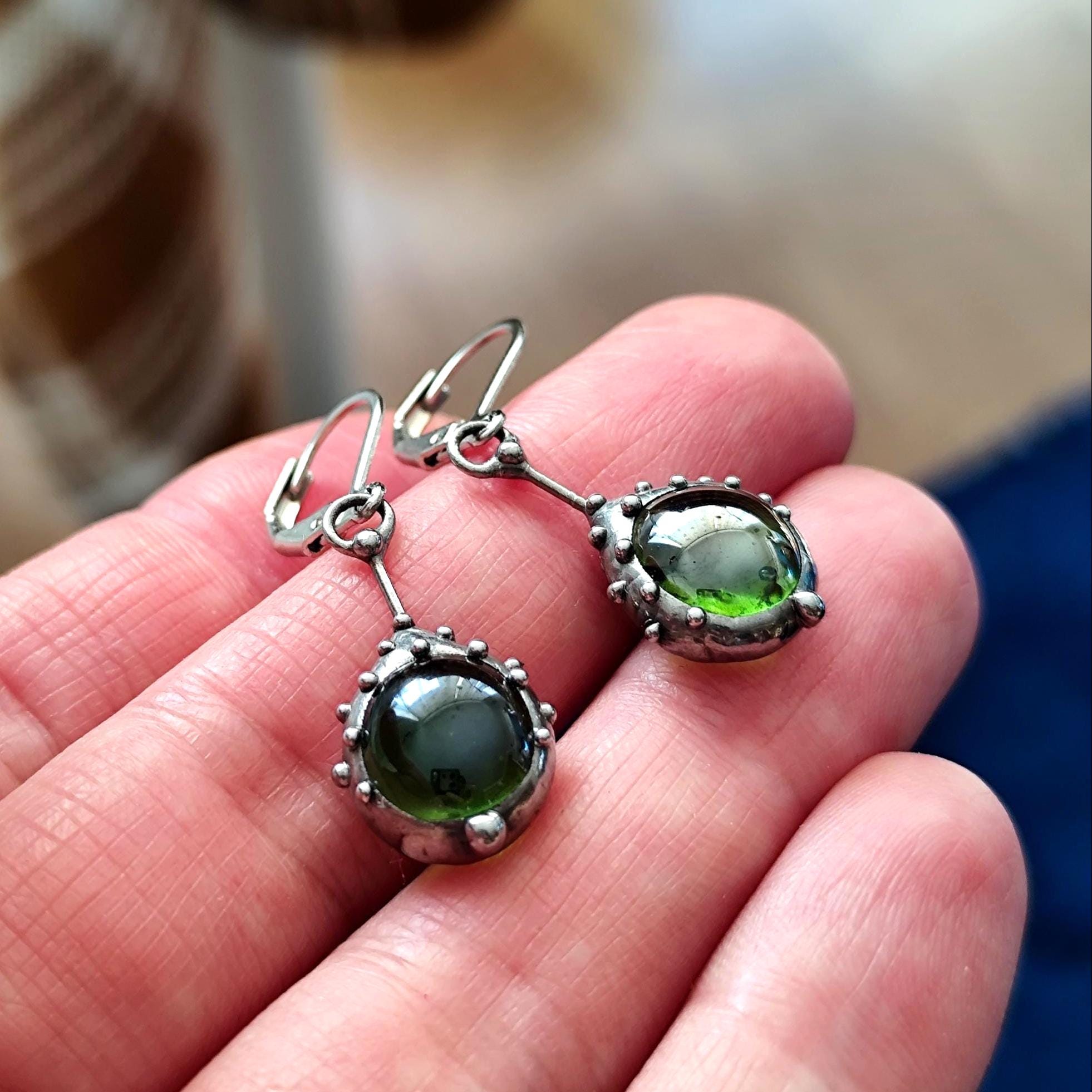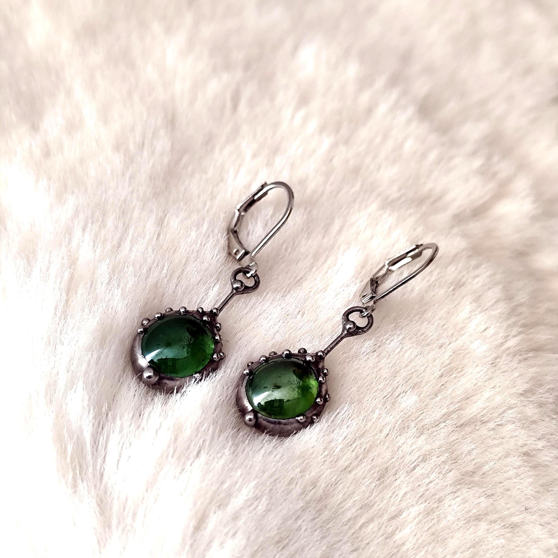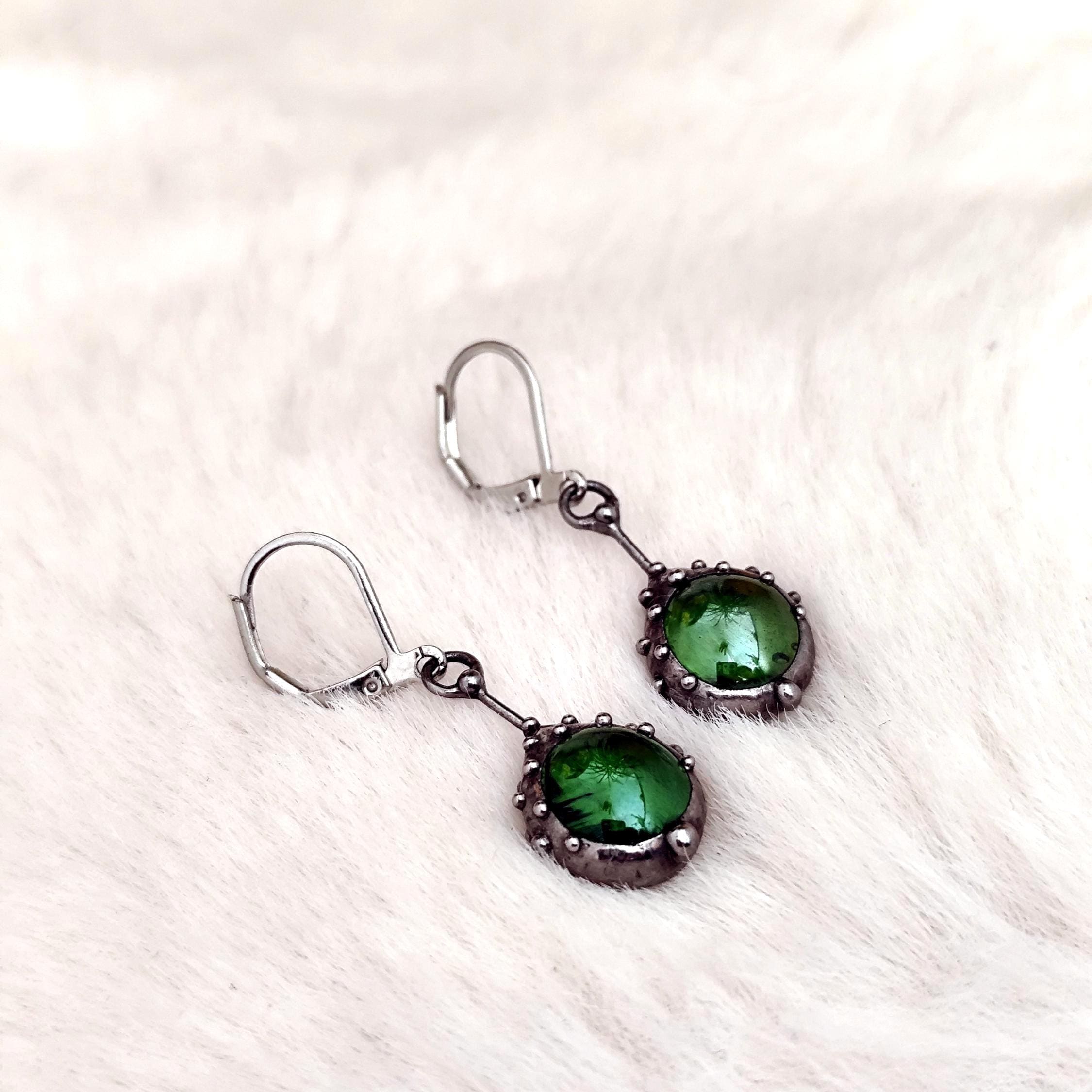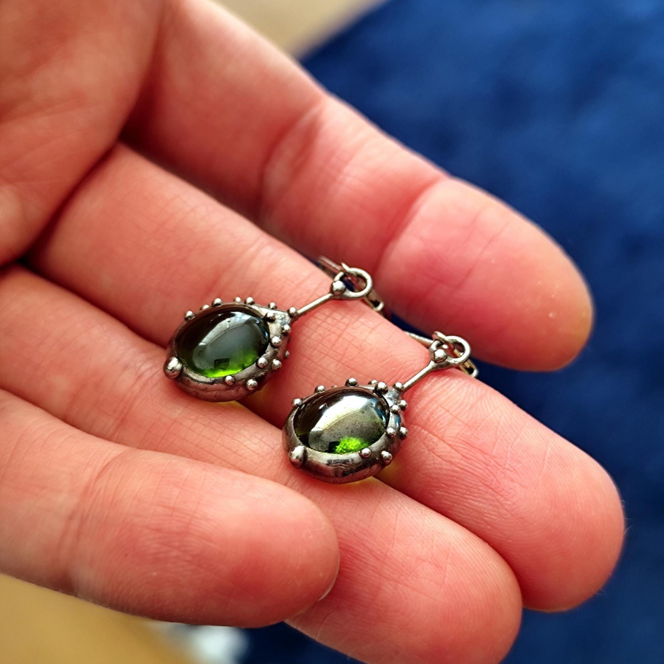 Stained glass minimalist simple geometry jewelry green earrings handcrafted from copper, steel, pewter, green glass. Treated with antioxidant, sanded, polished. Simple and sturdy handmade green glass suncatchers earrings. All elements are handmade, which ensures the individuality of each product made in the Yadovito workshop. The copper alloy is polished with a finishing solution to give the jewelry a noble appearance and at the same time so that the metal does not oxidize. Earrings use glass melted in a special furnace. After melting, the glass takes on an almost unique shape and amazing color. Color: silver/green. 2.5 * 1.3 cm (1 * 0.5 in).