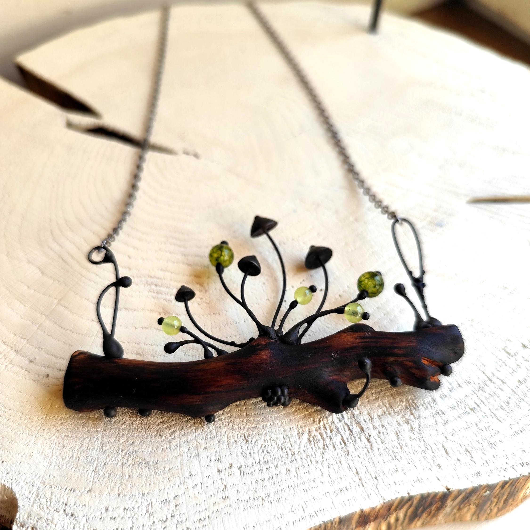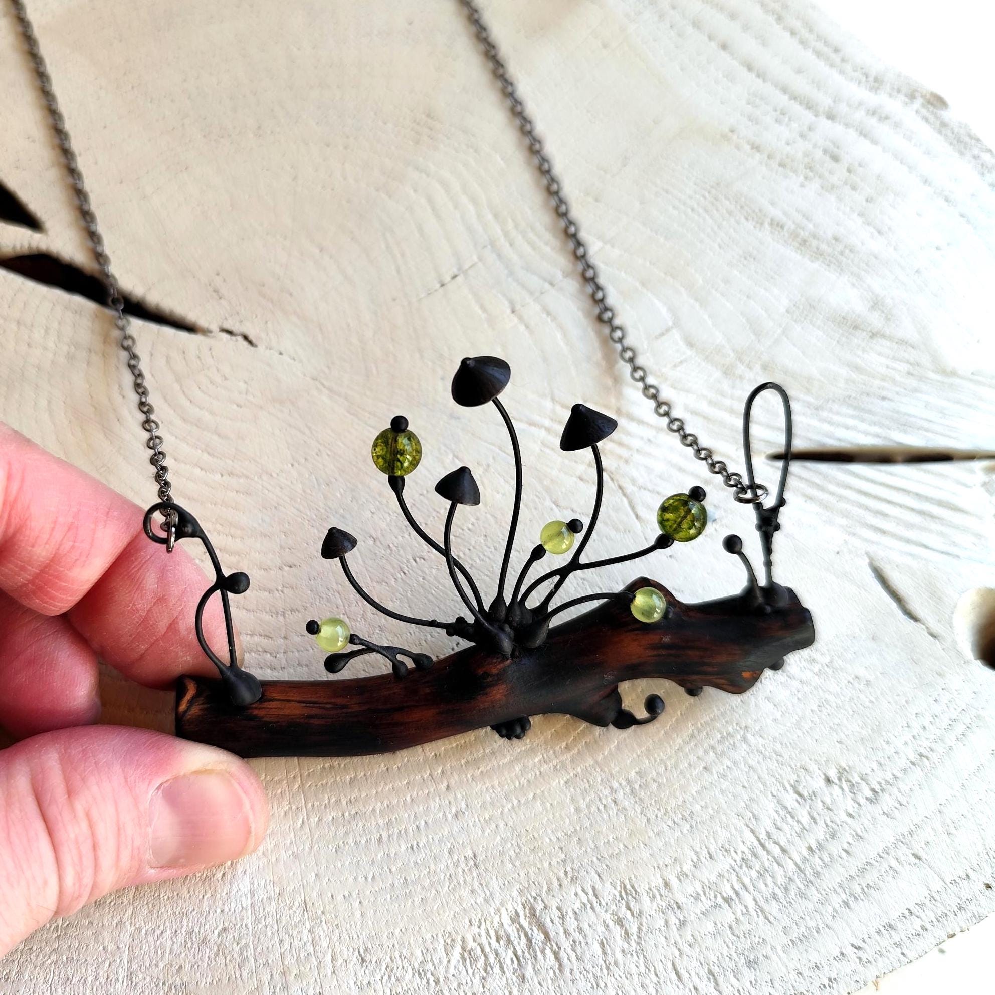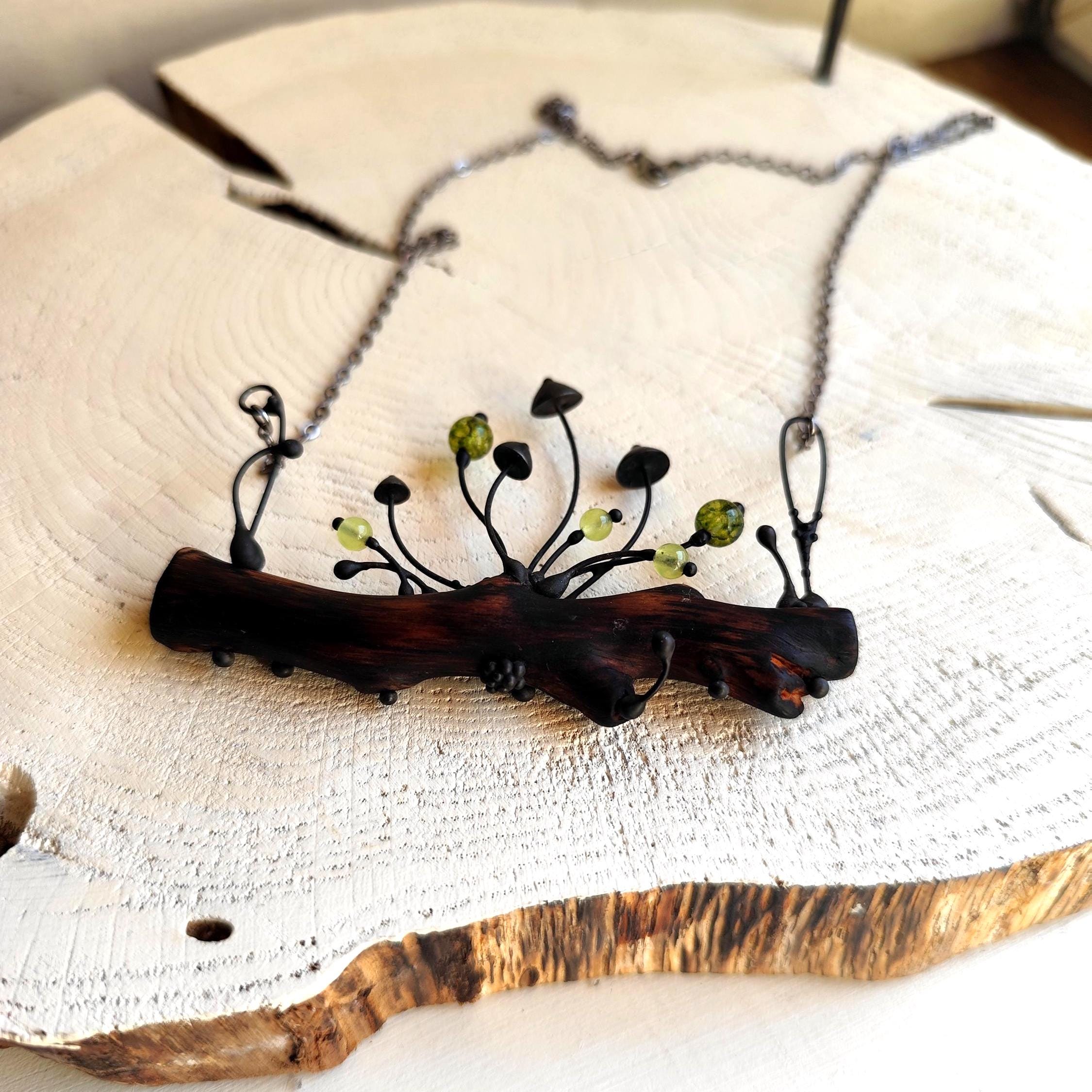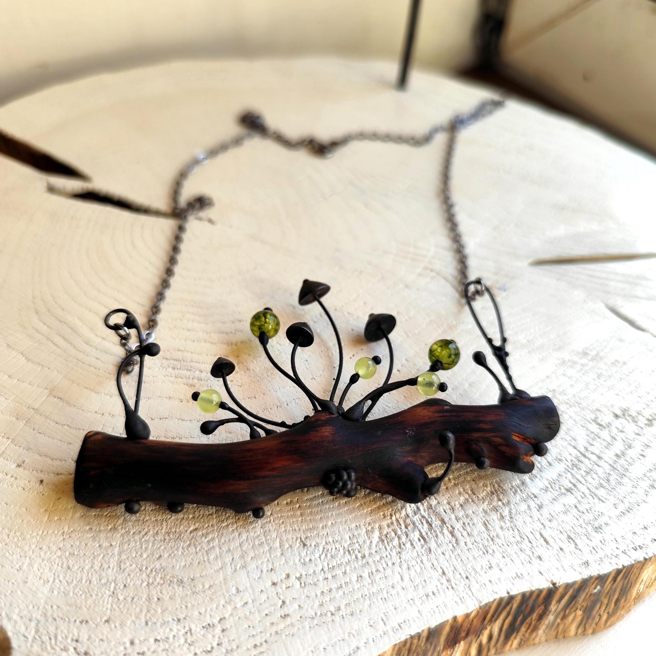 Psychedelic magic mushrooms wood necklace inspired by nature handmade from wood, copper, pewter alloy and green glass. Covered with patina and treated with antioxidant, sanded, polished. Light and sturdy fungi magic mushrooms forest necklace. All elements are handmade, which ensures the individuality of each product made in the Yadovito workshop. The copper alloy is coated with a black patina to color the metal black, polished with a finishing solution to give the jewelry a noble appearance and at the same time so that the metal does not oxidize. Each jewelry looks individually, because mushroom caps are made by hand, and not cast or stamped.