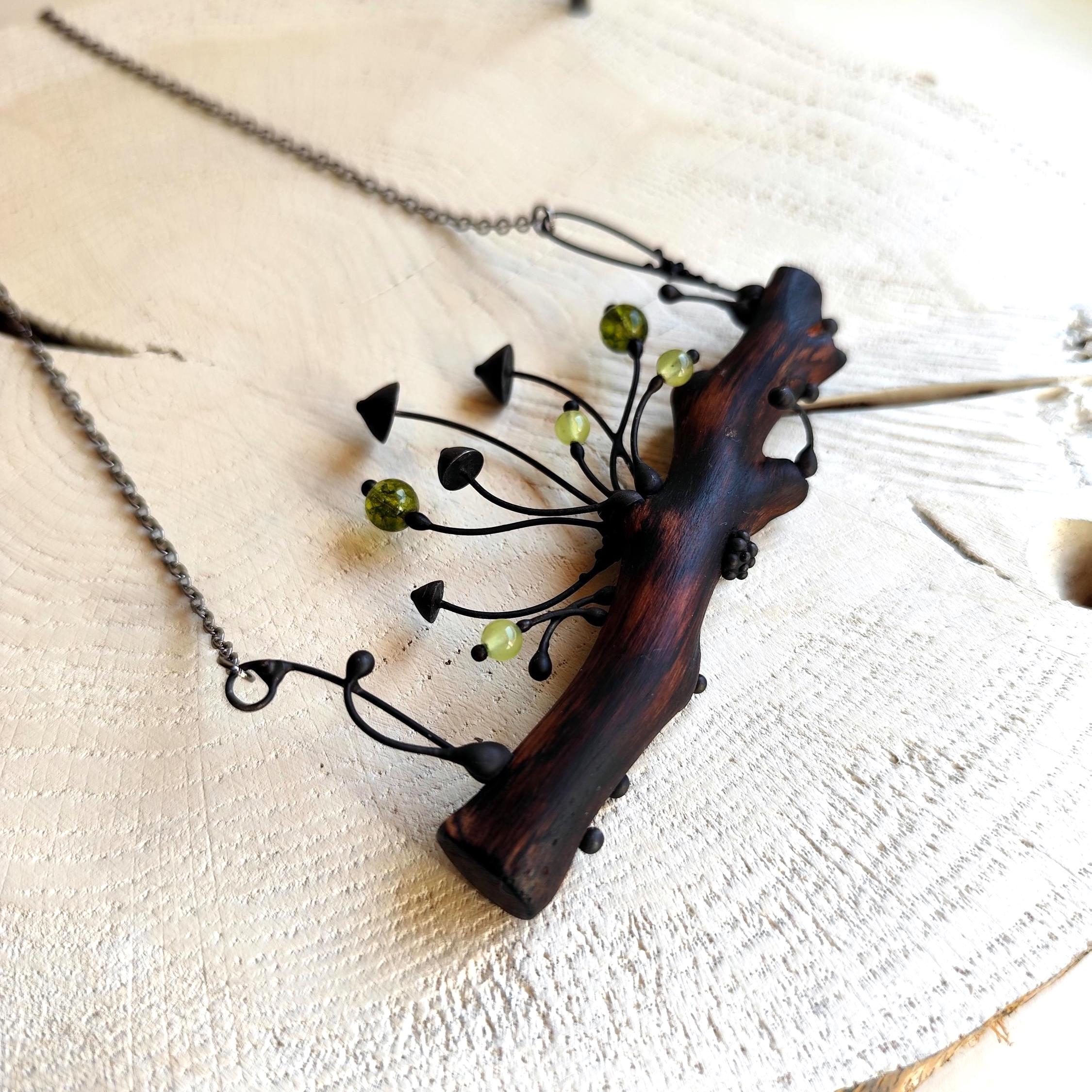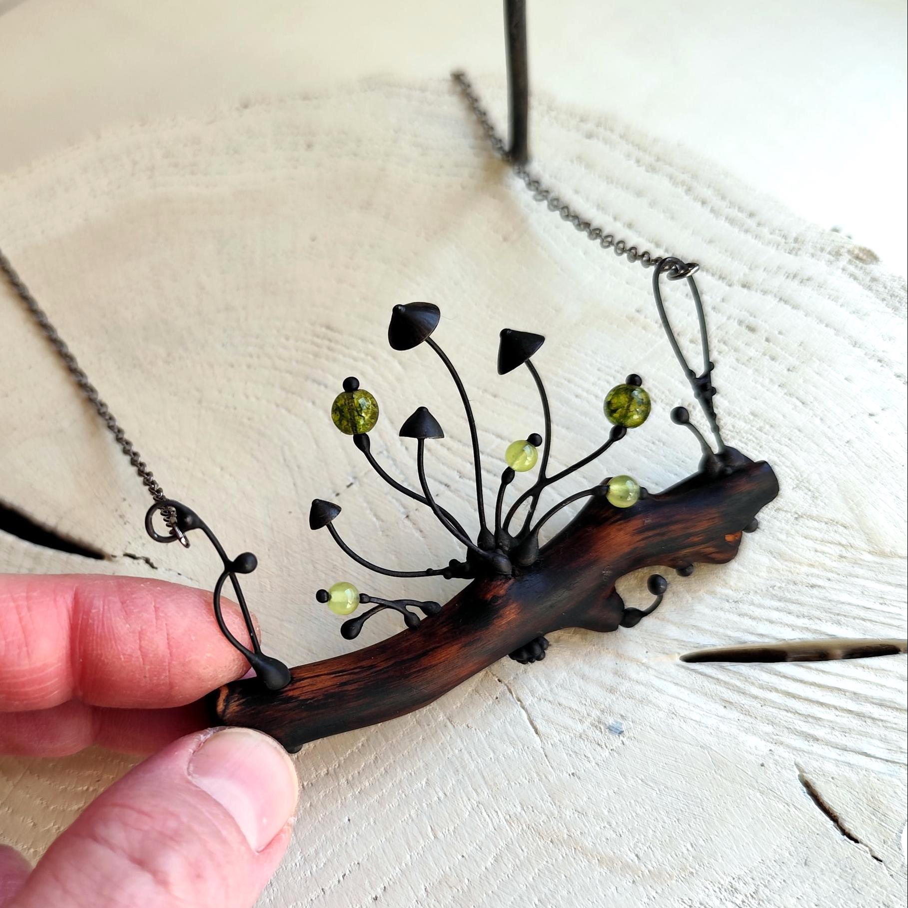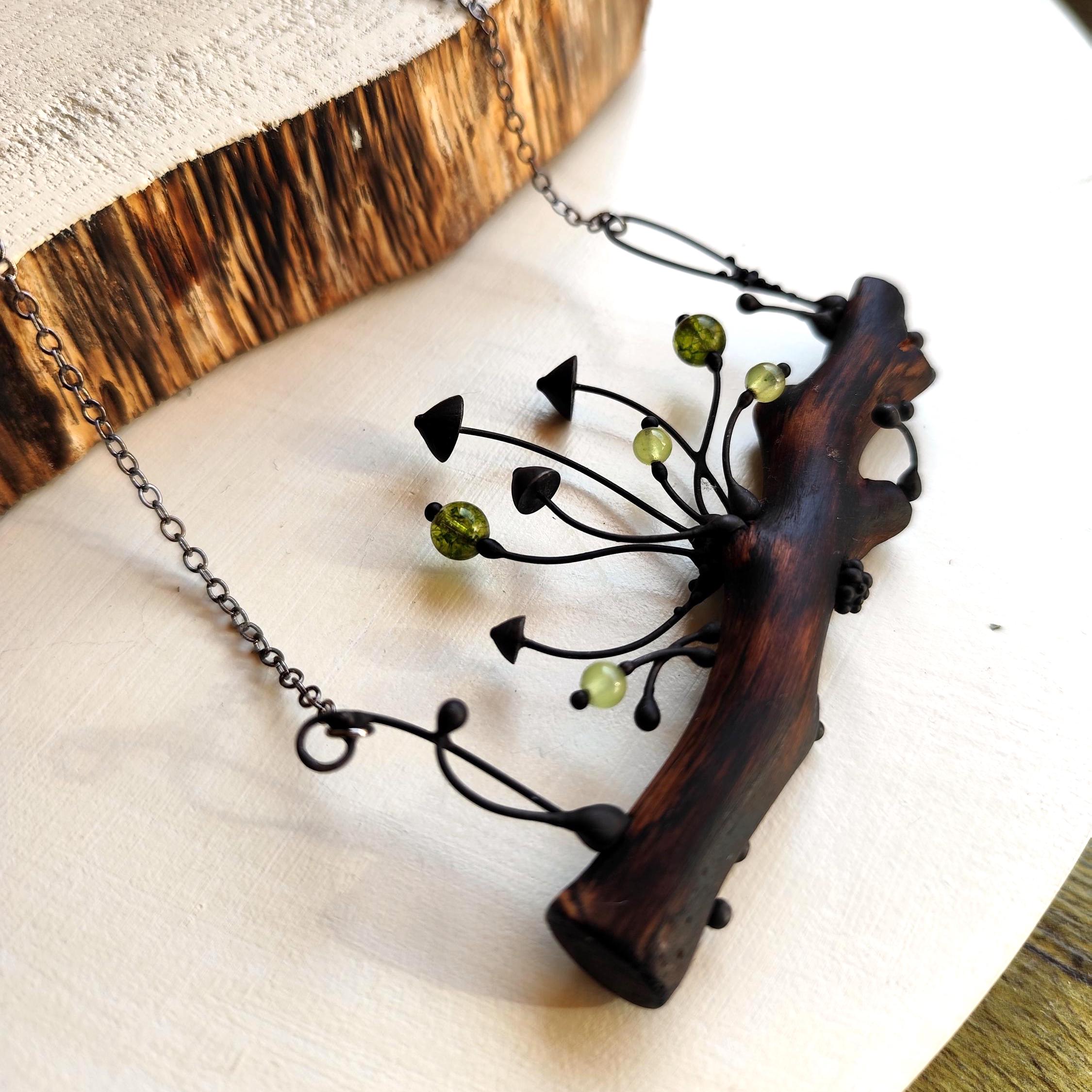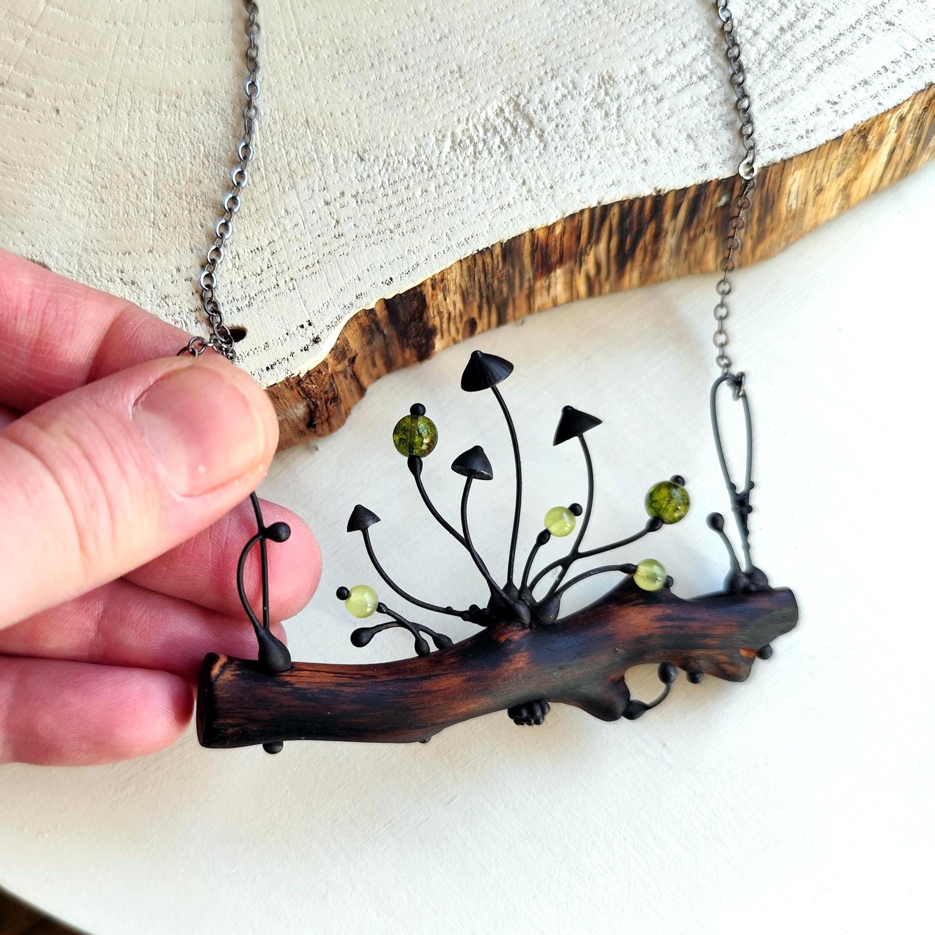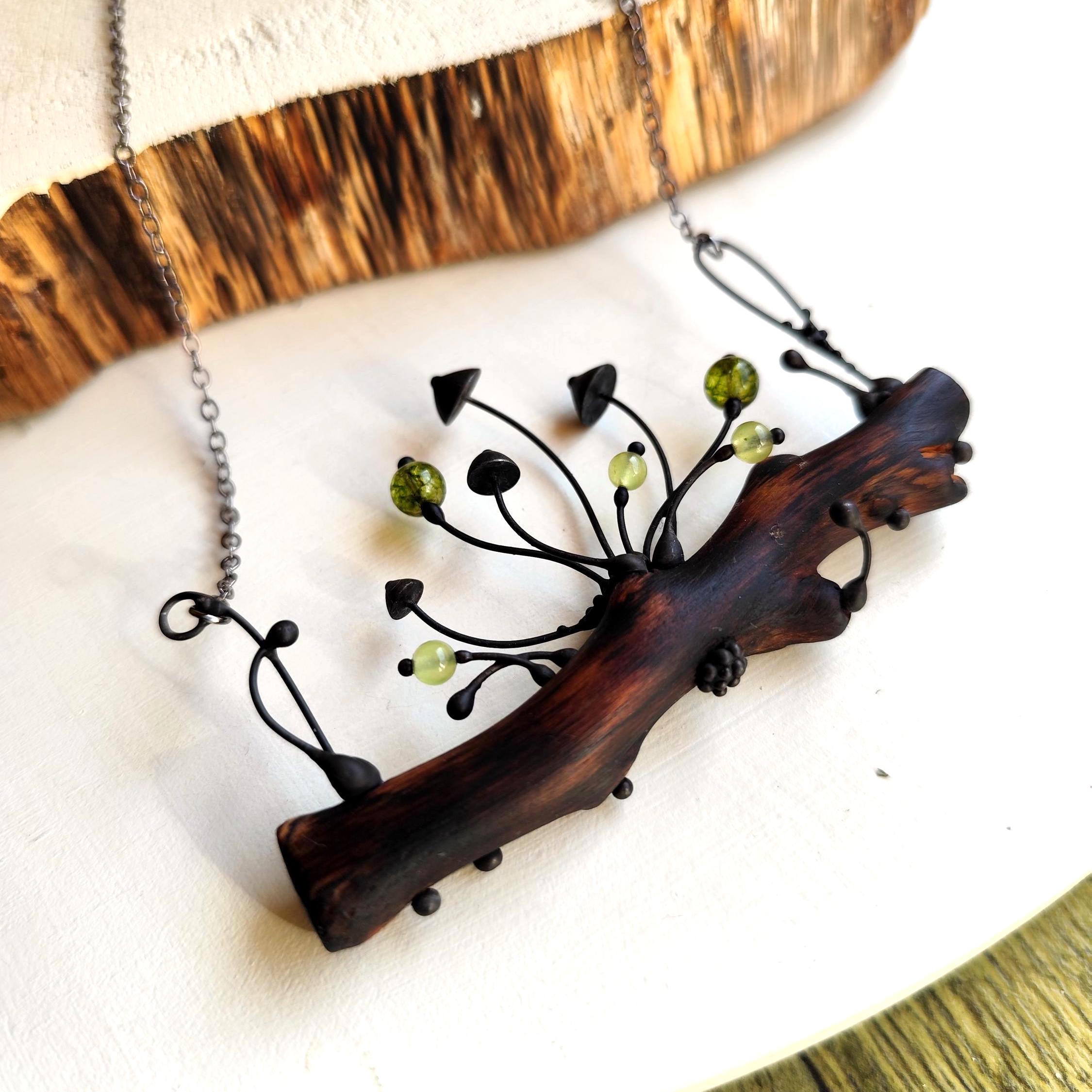 Psychedelic magic mushrooms wood necklace inspired by nature handmade from wood, copper, pewter alloy and green glass. Covered with patina and treated with antioxidant, sanded, polished. Light and sturdy fungi magic mushrooms forest necklace. All elements are handmade, which ensures the individuality of each product made in the Yadovito workshop. The copper alloy is coated with a black patina to color the metal black, polished with a finishing solution to give the jewelry a noble appearance and at the same time so that the metal does not oxidize. Each jewelry looks individually, because mushroom caps are made by hand, and not cast or stamped.