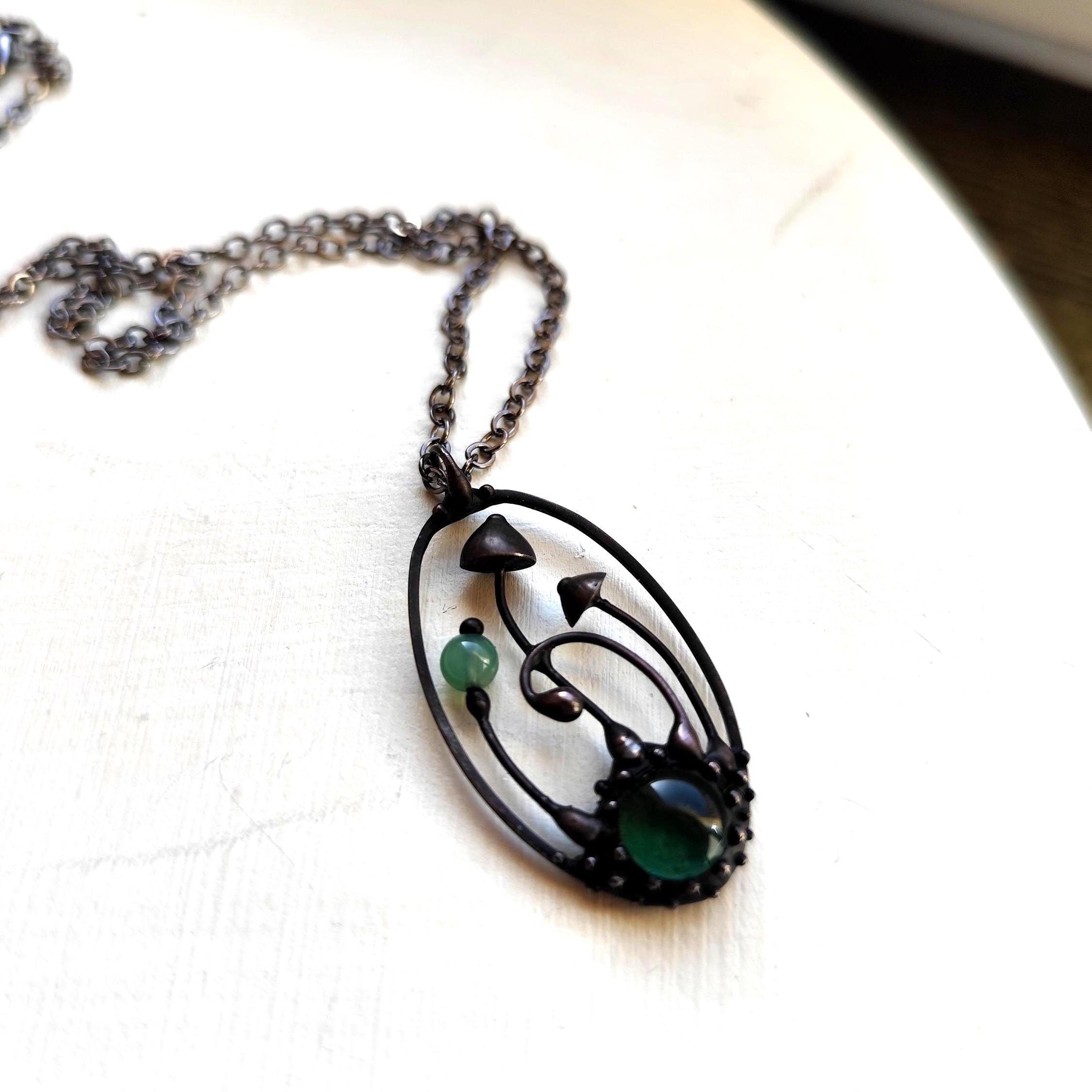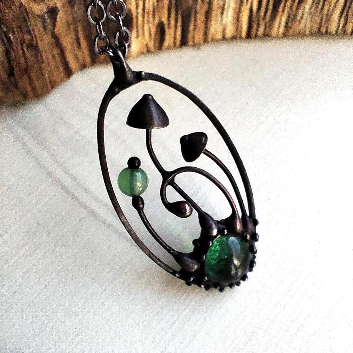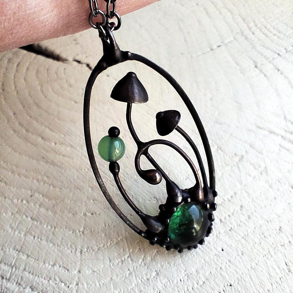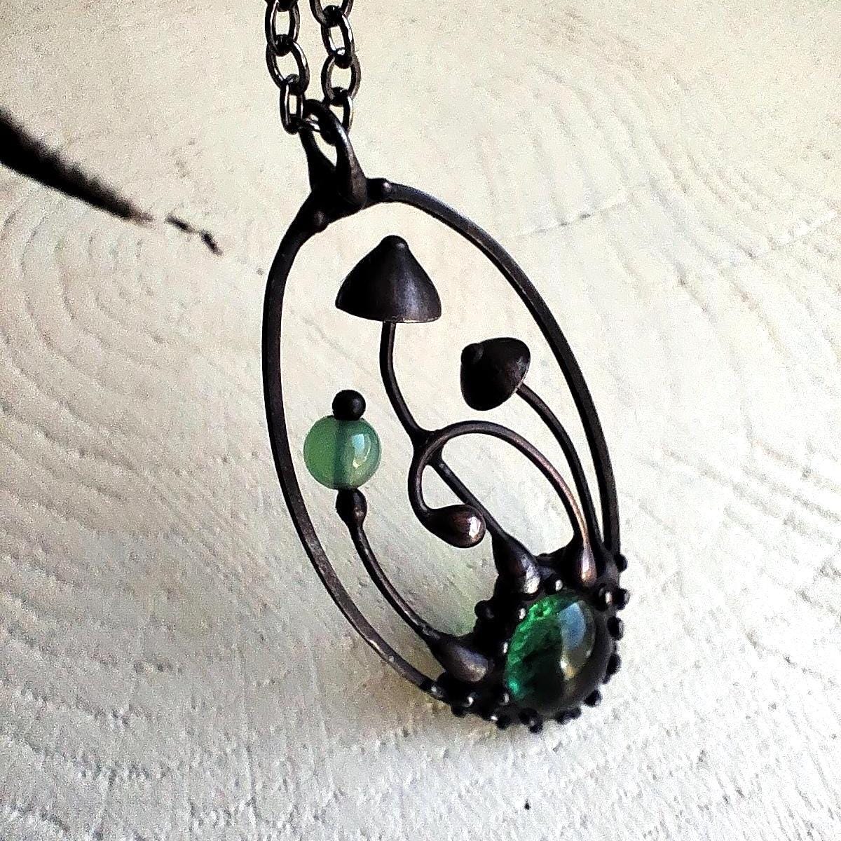 Boho minimalist magic mushrooms handmade small oval metal necklace pendant from copper, pewter, steel and glass. Covered with patina and treated with antioxidant, sanded, polished. Light and sturdy unusual boho hippie psychedelic necklace with shrooms. All elements are handmade, which ensures the individuality of each product made in the Yadovito workshop. The copper alloy is coated with a black patina to color the metal black, polished with a finishing solution to give the jewelry a noble appearance and at the same time so that the metal does not oxidize. Each jewelry looks individually, because mushroom caps are made by hand, and not cast or stamped. Size about 4 * 2 cm (1.5 * 0.8 in). Color black/green.