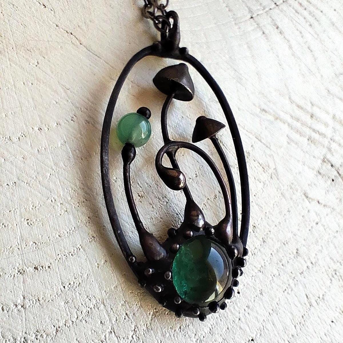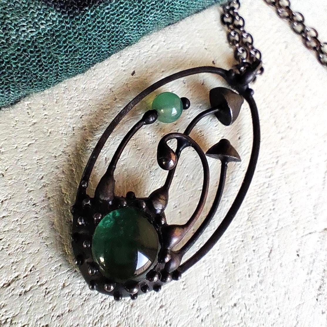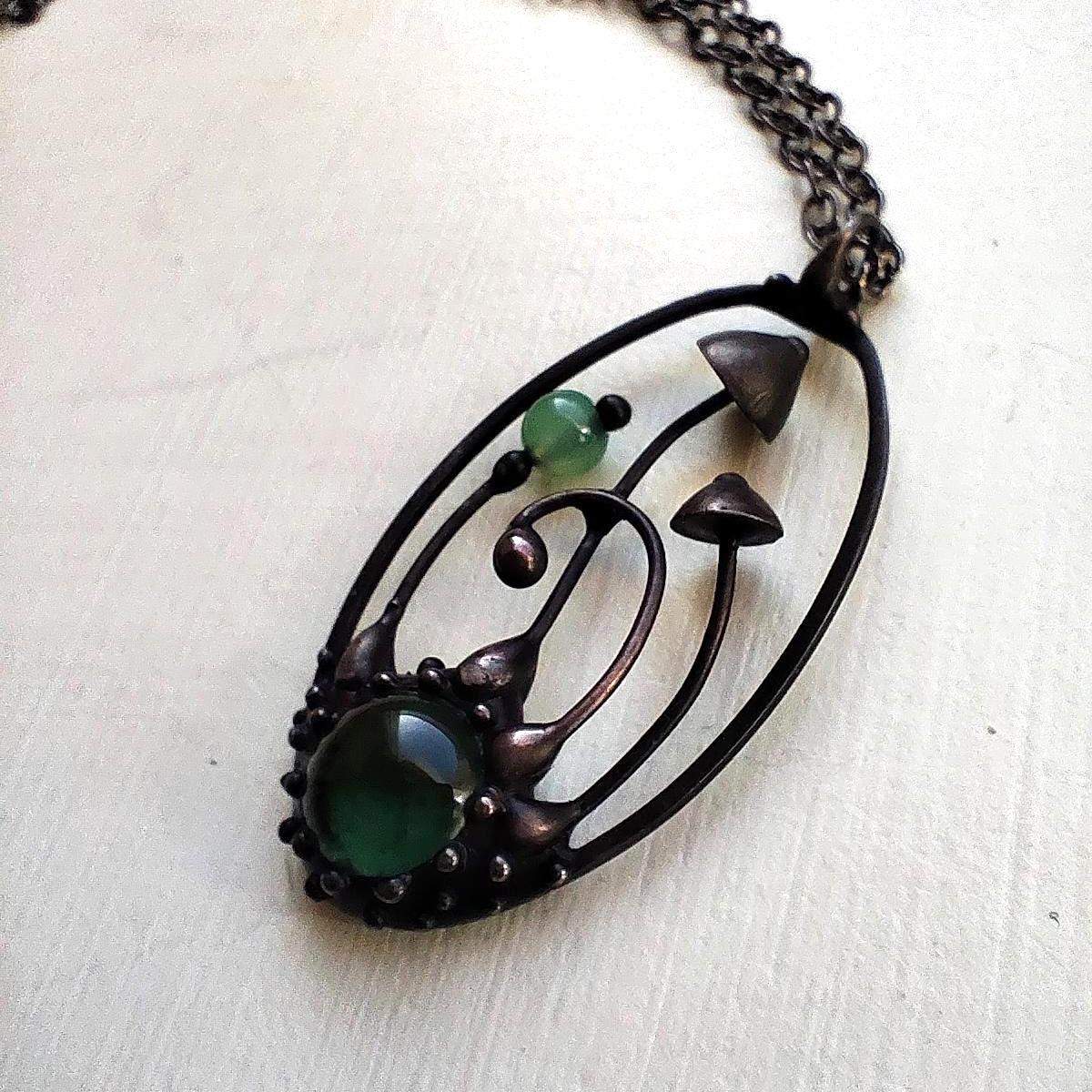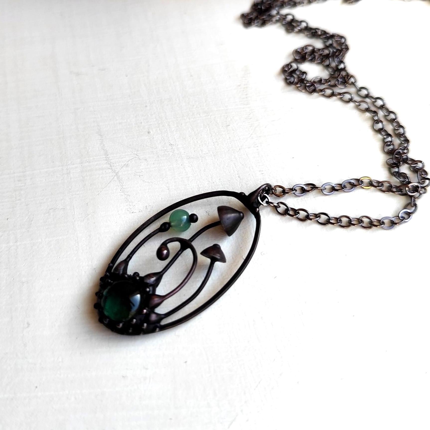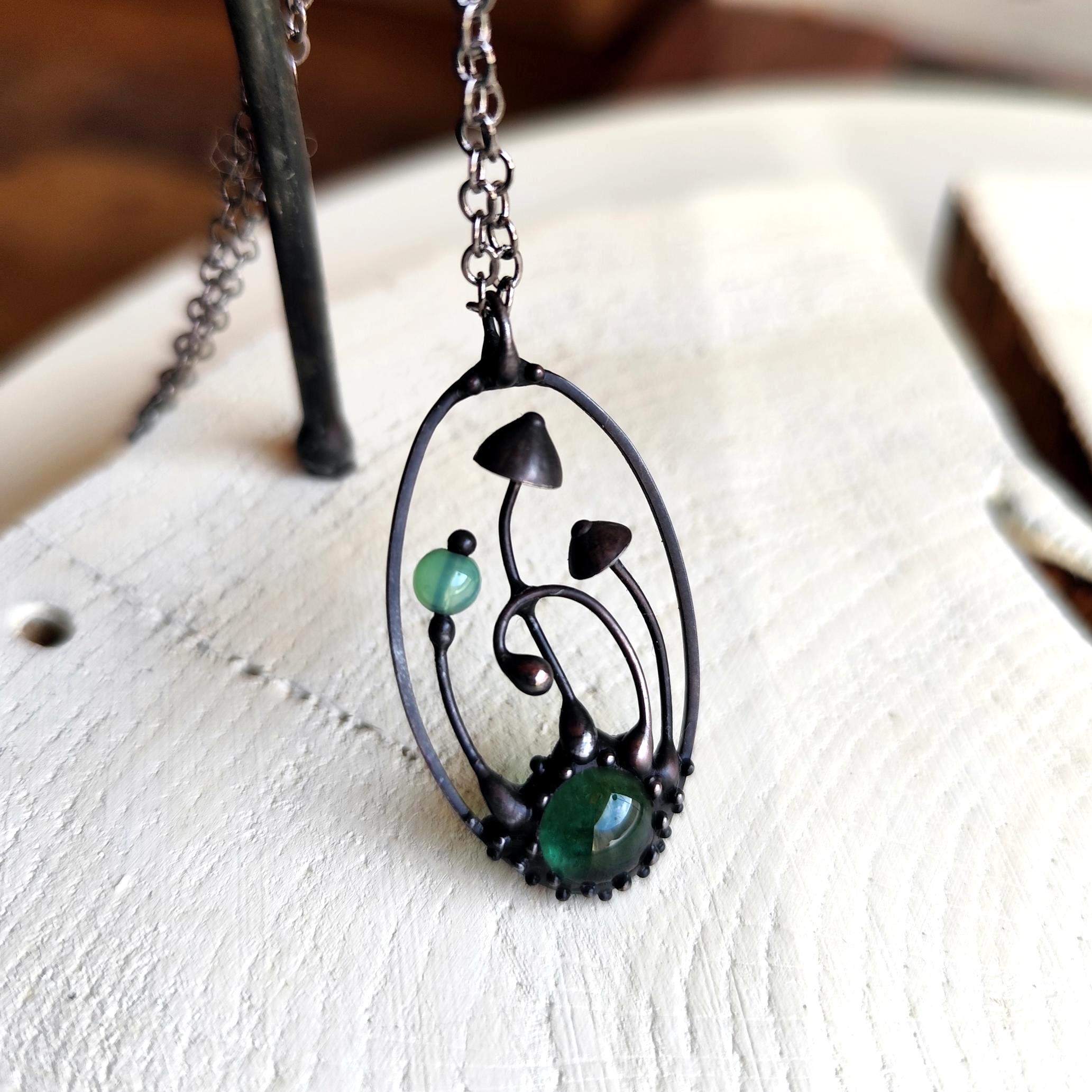 Boho minimalist magic mushrooms handmade small oval metal necklace pendant from copper, pewter, steel and glass. Covered with patina and treated with antioxidant, sanded, polished. Light and sturdy unusual boho hippie psychedelic necklace with shrooms. All elements are handmade, which ensures the individuality of each product made in the Yadovito workshop. The copper alloy is coated with a black patina to color the metal black, polished with a finishing solution to give the jewelry a noble appearance and at the same time so that the metal does not oxidize. Each jewelry looks individually, because mushroom caps are made by hand, and not cast or stamped. Size about 4 * 2 cm (1.5 * 0.8 in). Color black/green.