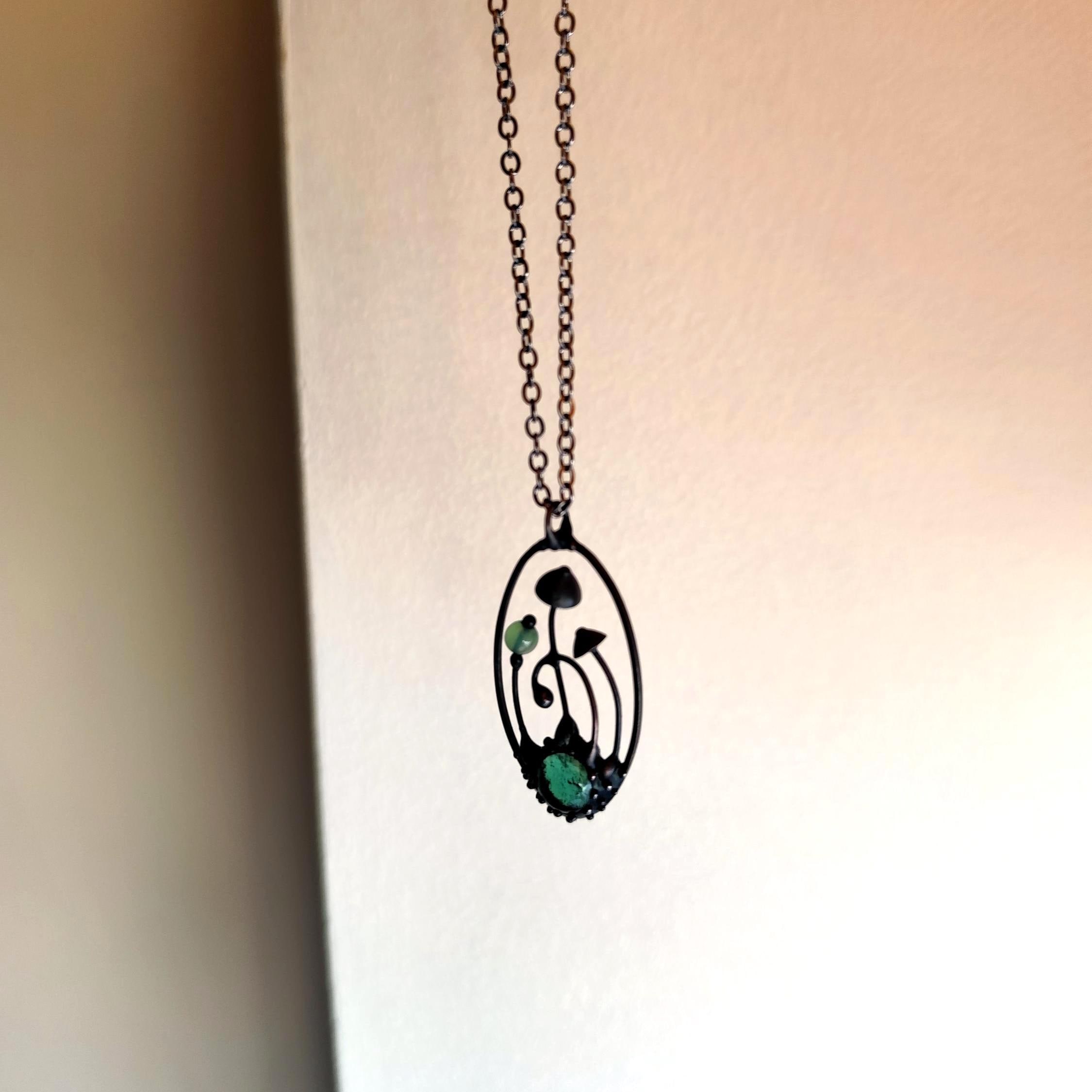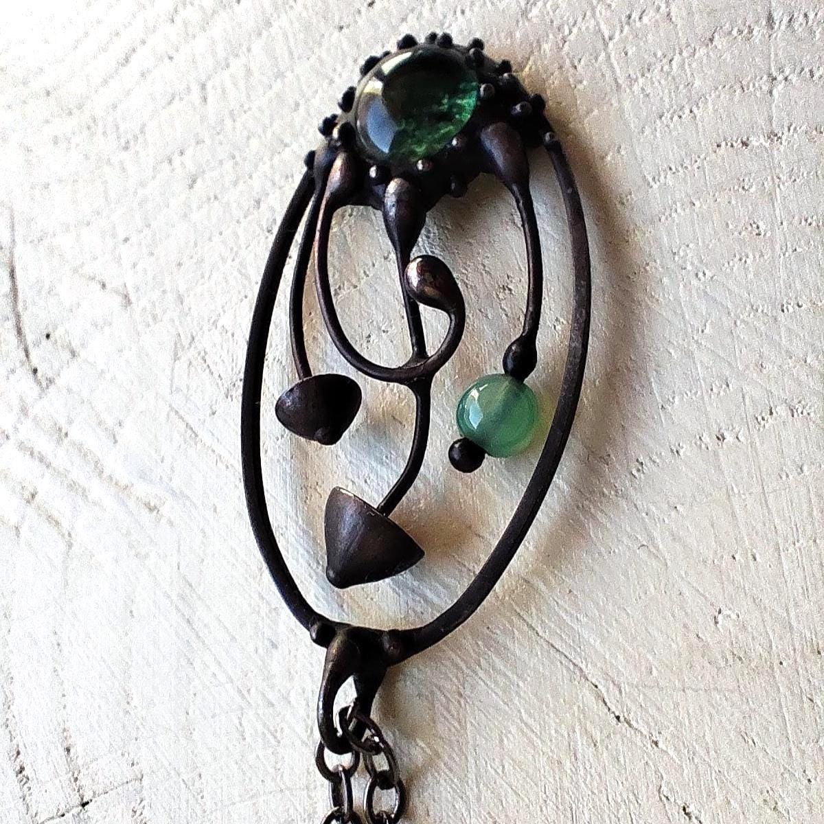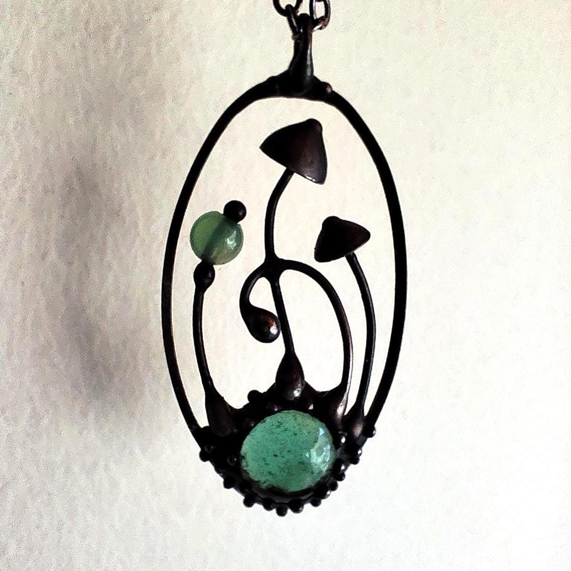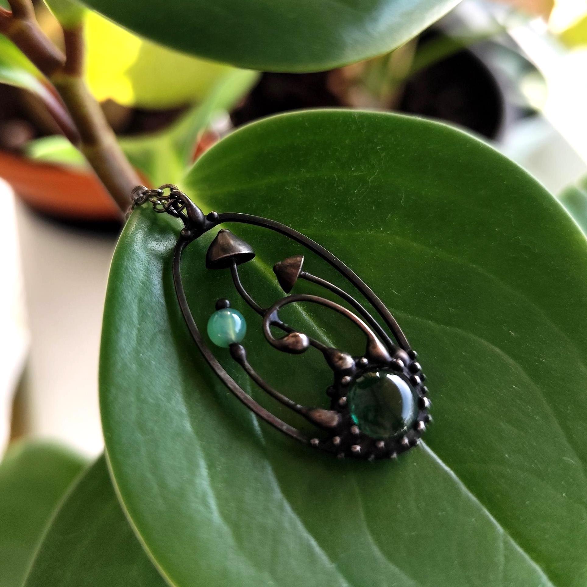 Boho minimalist magic mushrooms handmade small oval metal necklace pendant from copper, pewter, steel and glass. Covered with patina and treated with antioxidant, sanded, polished. Light and sturdy unusual boho hippie psychedelic necklace with shrooms. All elements are handmade, which ensures the individuality of each product made in the Yadovito workshop. The copper alloy is coated with a black patina to color the metal black, polished with a finishing solution to give the jewelry a noble appearance and at the same time so that the metal does not oxidize. Each jewelry looks individually, because mushroom caps are made by hand, and not cast or stamped. Size about 4 * 2 cm (1.5 * 0.8 in). Color black/green.