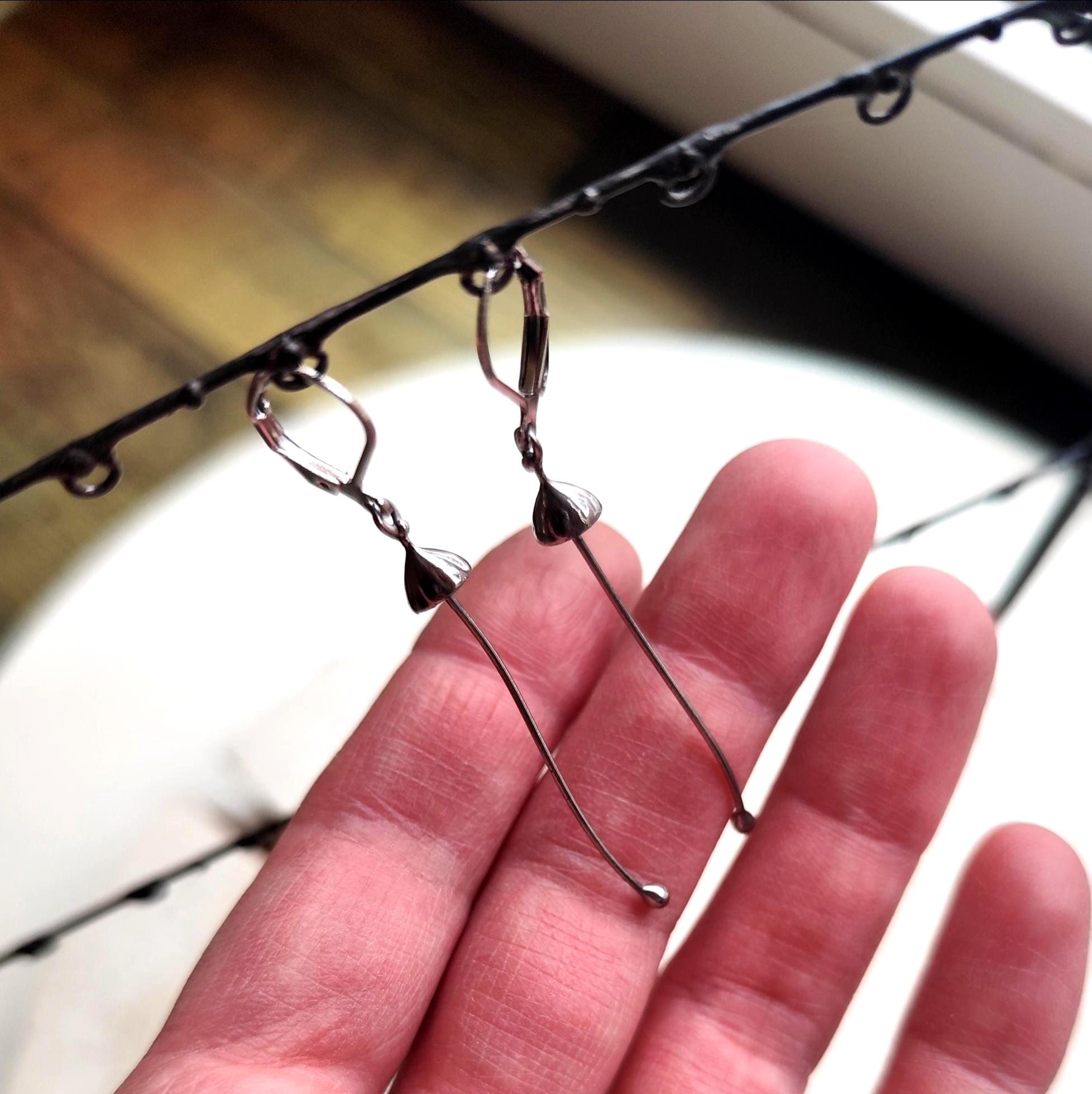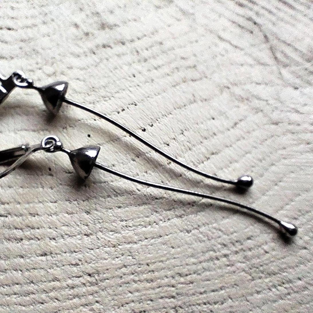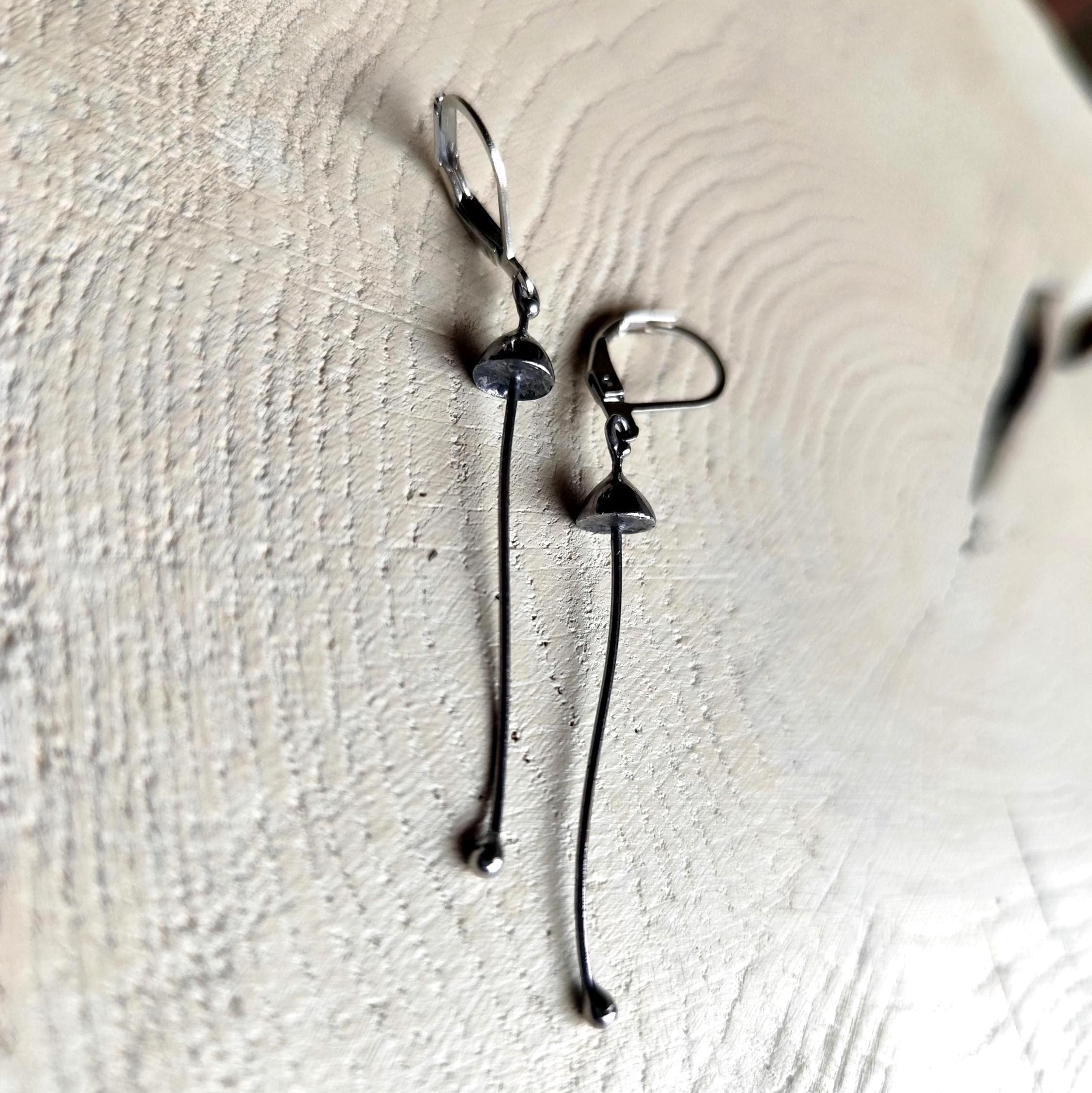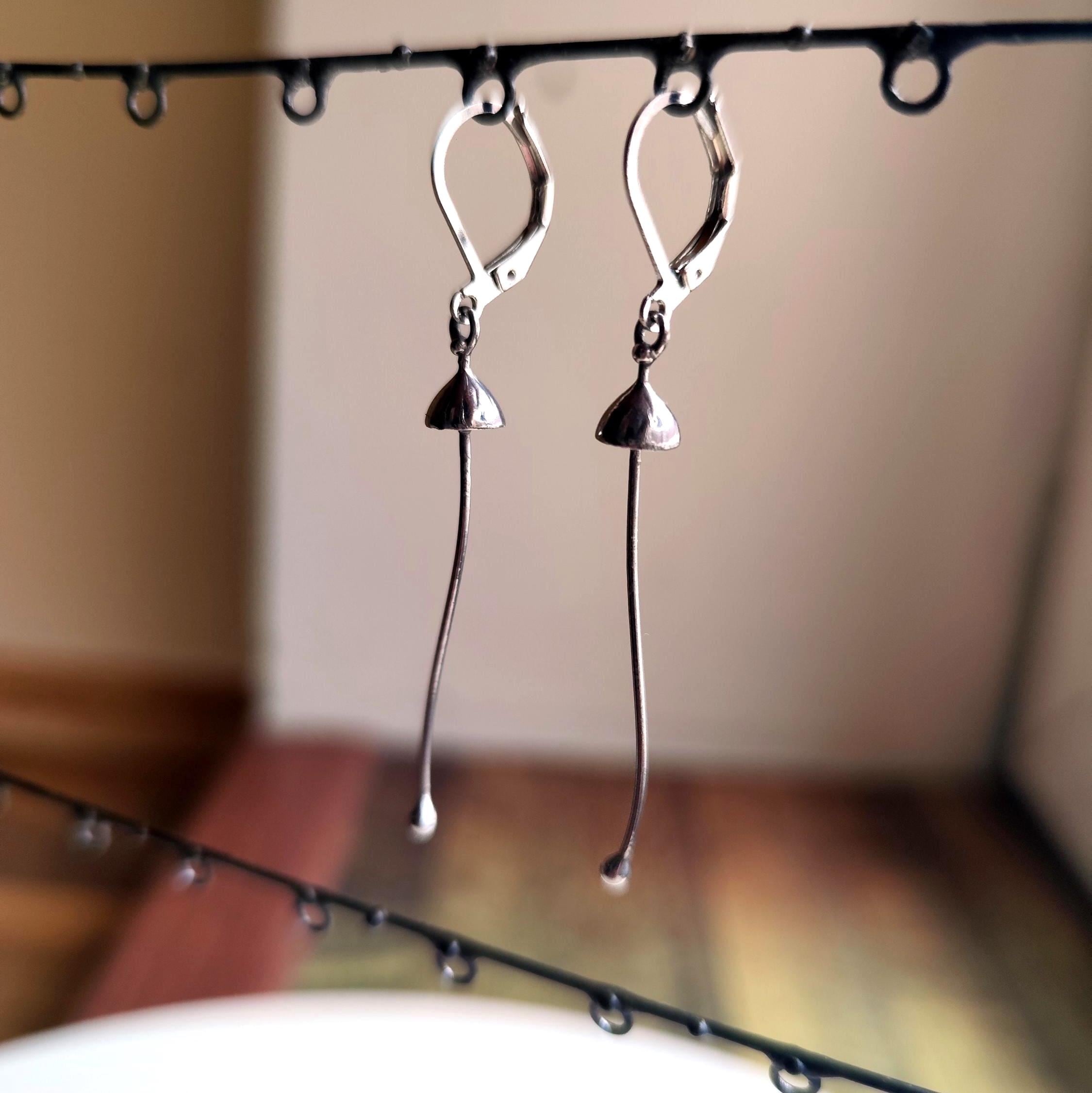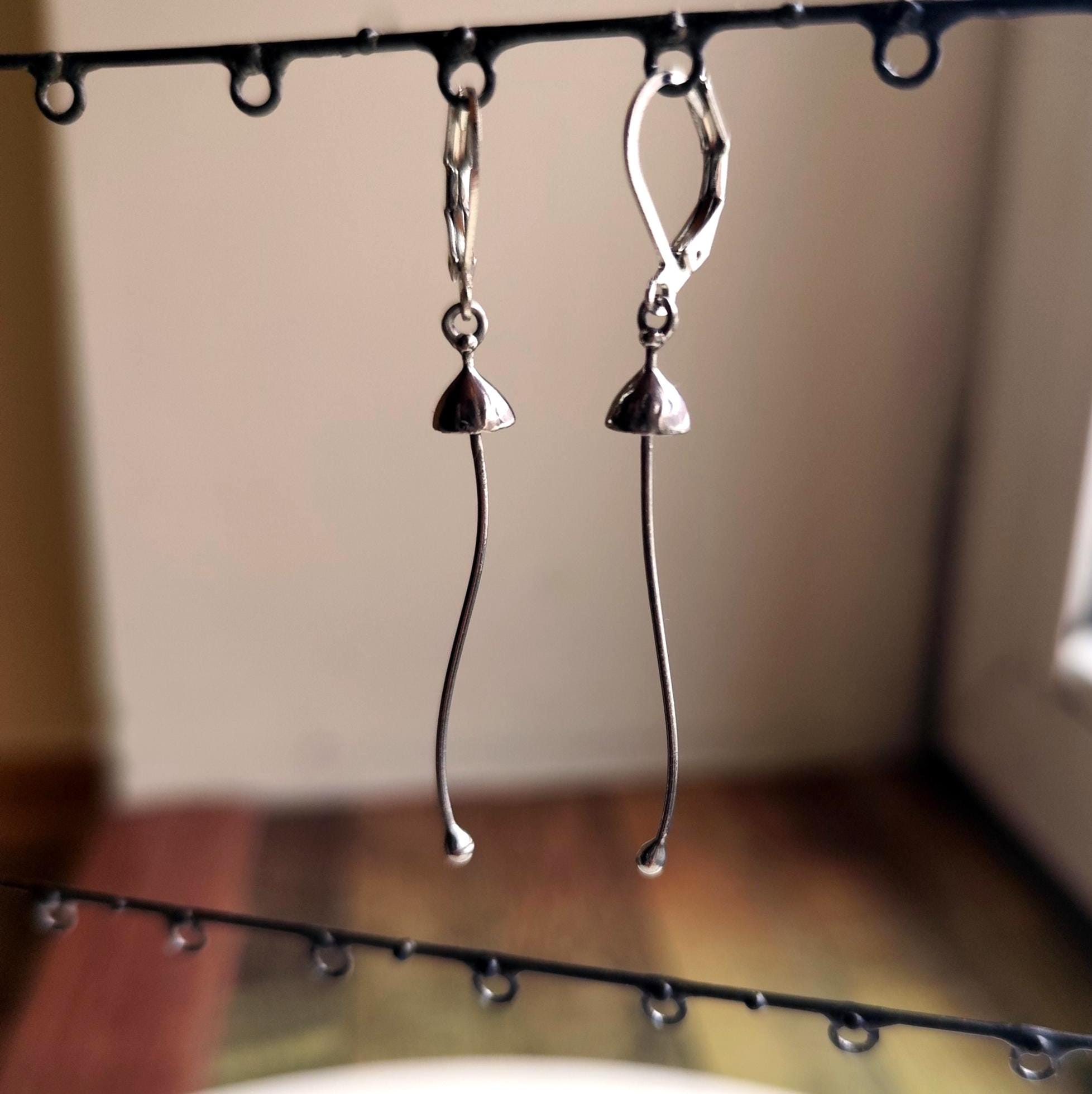 Minimalist modern floral design forest dangle earrings mushrooms handcrafted from copper, pewter, steel. Treated with antioxidant, sanded, polished. Sturdy and light psychedelic dangle earrings. All elements are handmade, which ensures the individuality of each product made in the Yadovito workshop. Each jewelry looks individually, because mushroom caps are made by hand, and not cast or stamped. The earrings are made of a shiny metal and have a modern, minimalist style. Size about 4.5 * 0.6 cm (1.7 * 0.23 in). Color silver.