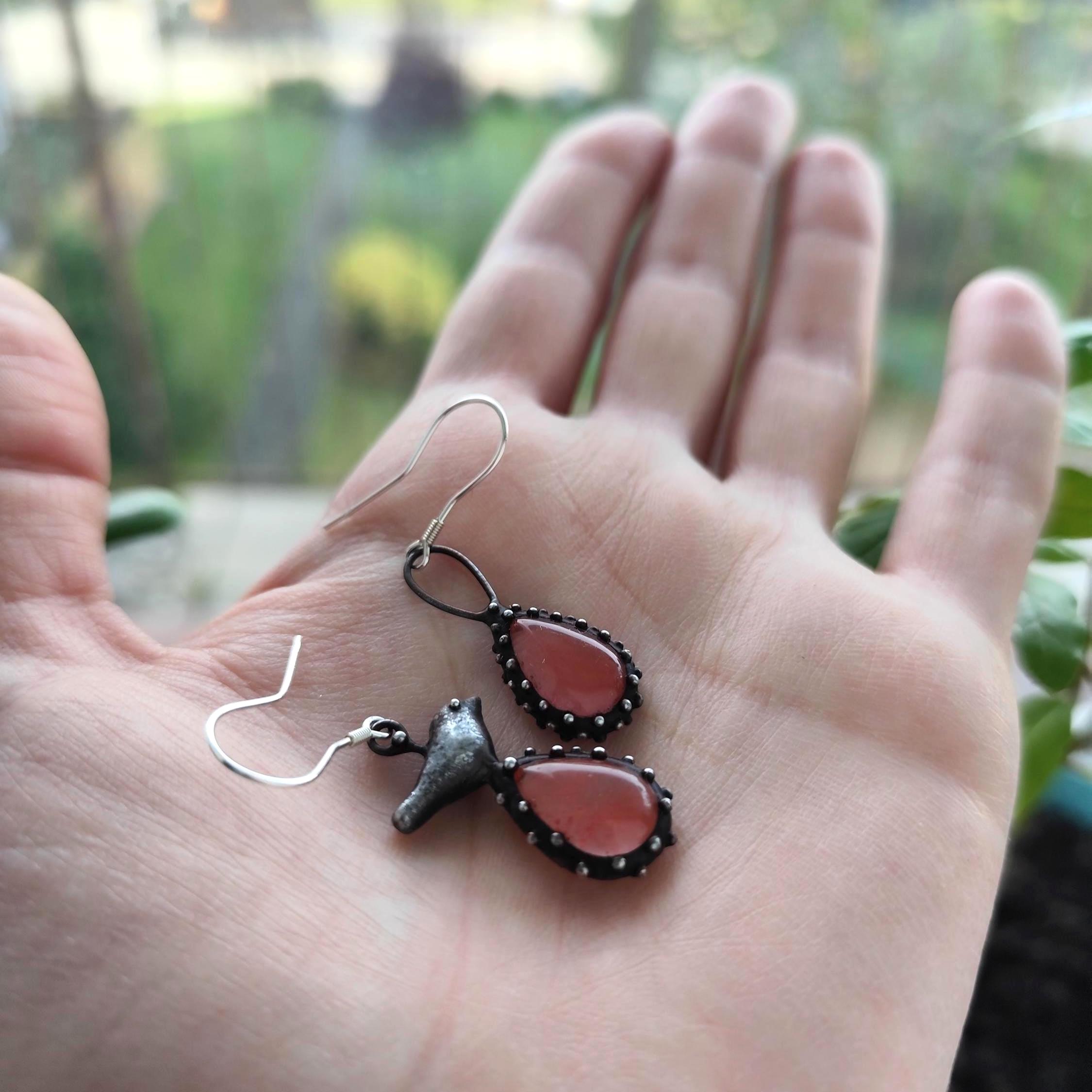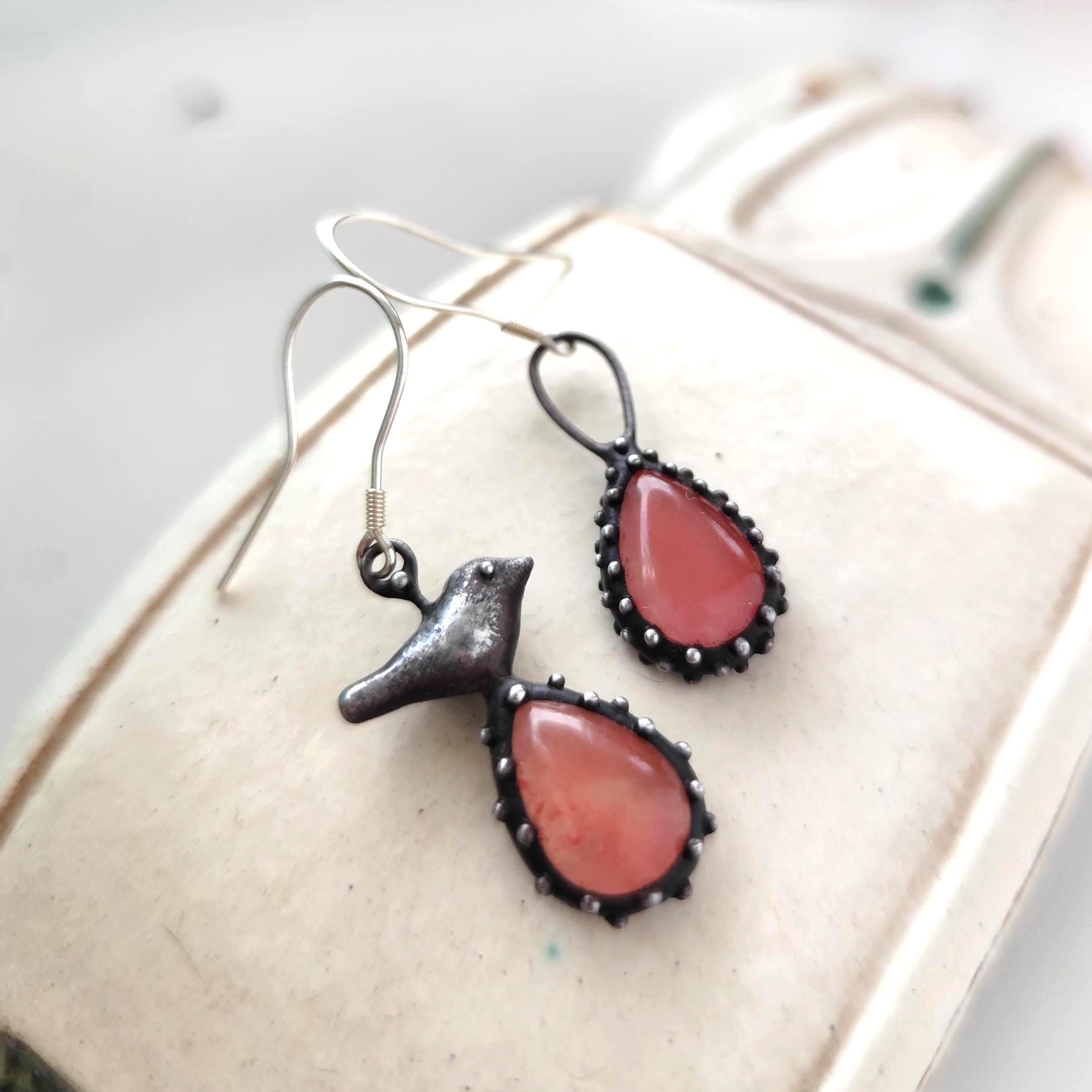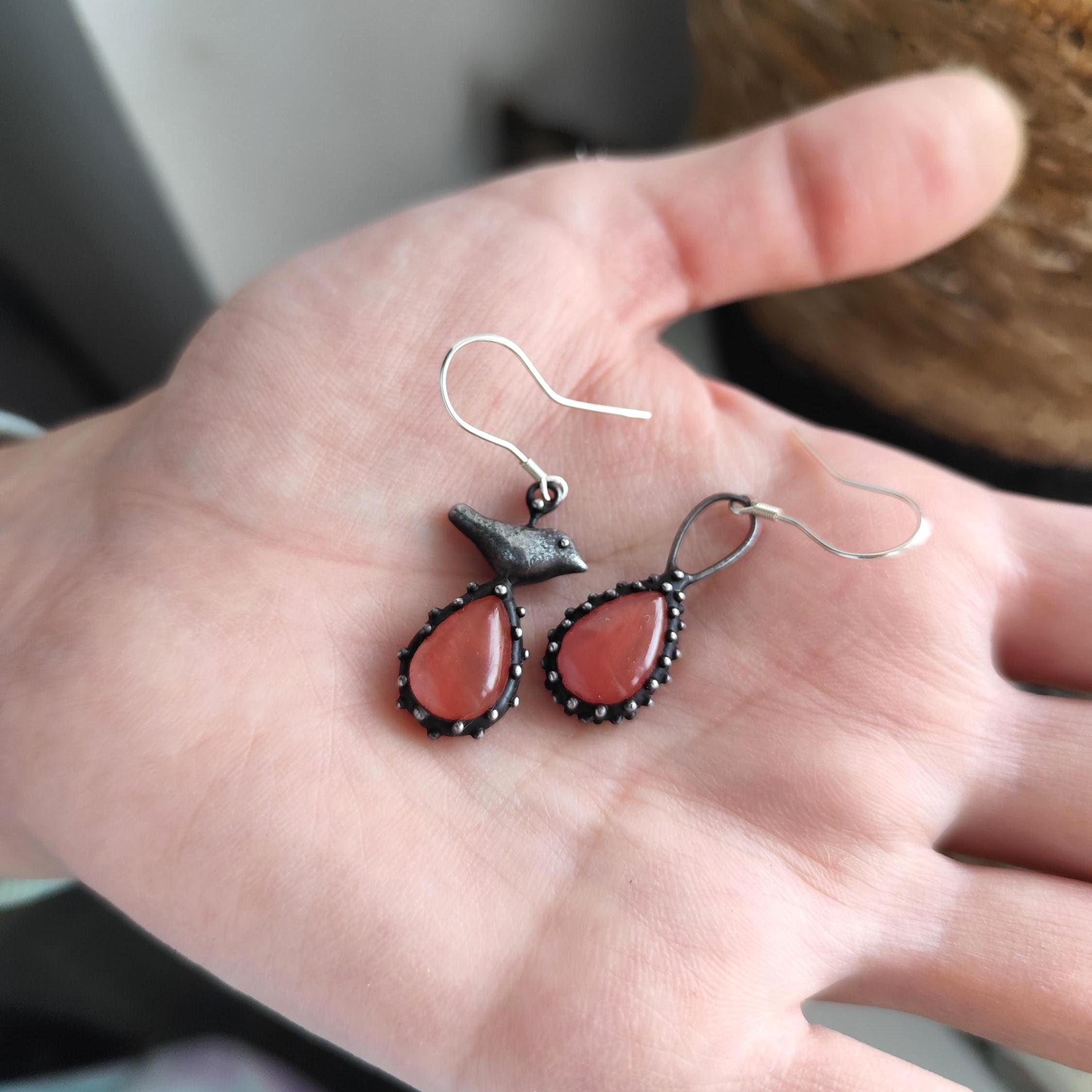 Asymmetrical earrings metal black bird inspired by wild forest nature handmade from copper, pewter, stainless steel and watermelon quartz. Covered with patina, treated with antioxidant, sanded, polished. Statement and strong, aesthetic forest jewelry. All elements are handmade, which ensures the individuality of each product made in the Yadovito workshop. The copper alloy is polished with a finishing solution to give the jewelry a noble appearance and at the same time so that the metal does not oxidize. Color: Black/pink. Size about 2.5 * 1.5 cm (1 * 0.6 in).