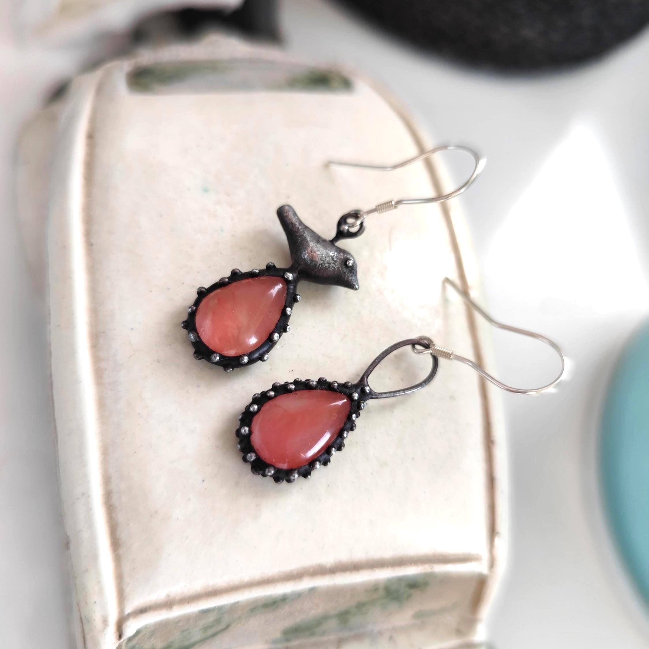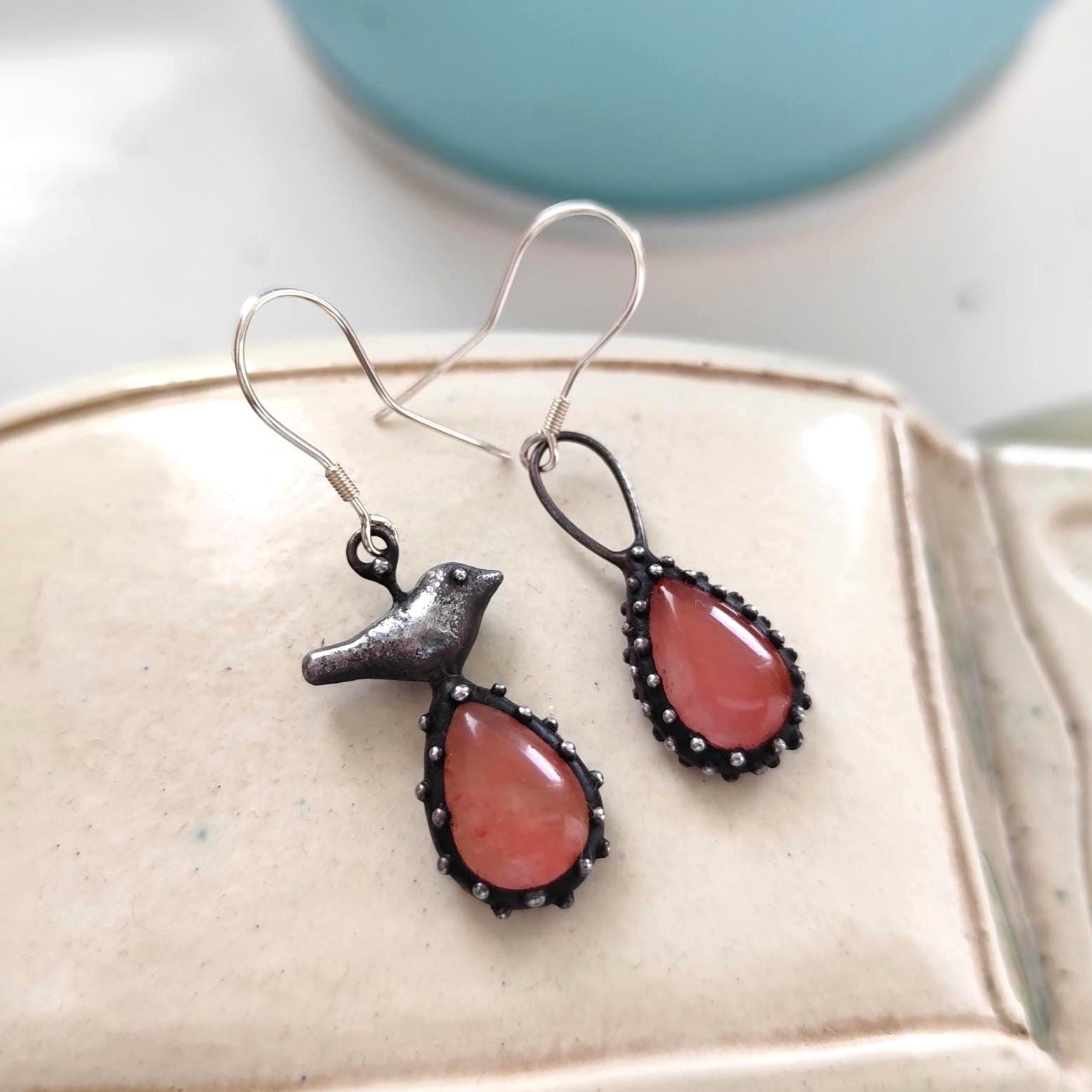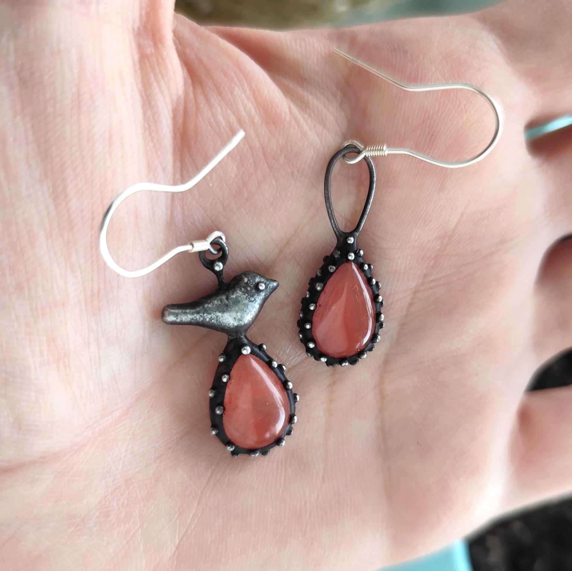 Asymmetrical earrings metal black bird inspired by wild forest nature handmade from copper, pewter, stainless steel and watermelon quartz. Covered with patina, treated with antioxidant, sanded, polished. Statement and strong, aesthetic forest jewelry. All elements are handmade, which ensures the individuality of each product made in the Yadovito workshop. The copper alloy is polished with a finishing solution to give the jewelry a noble appearance and at the same time so that the metal does not oxidize. Color: Black/pink. Size about 2.5 * 1.5 cm (1 * 0.6 in).