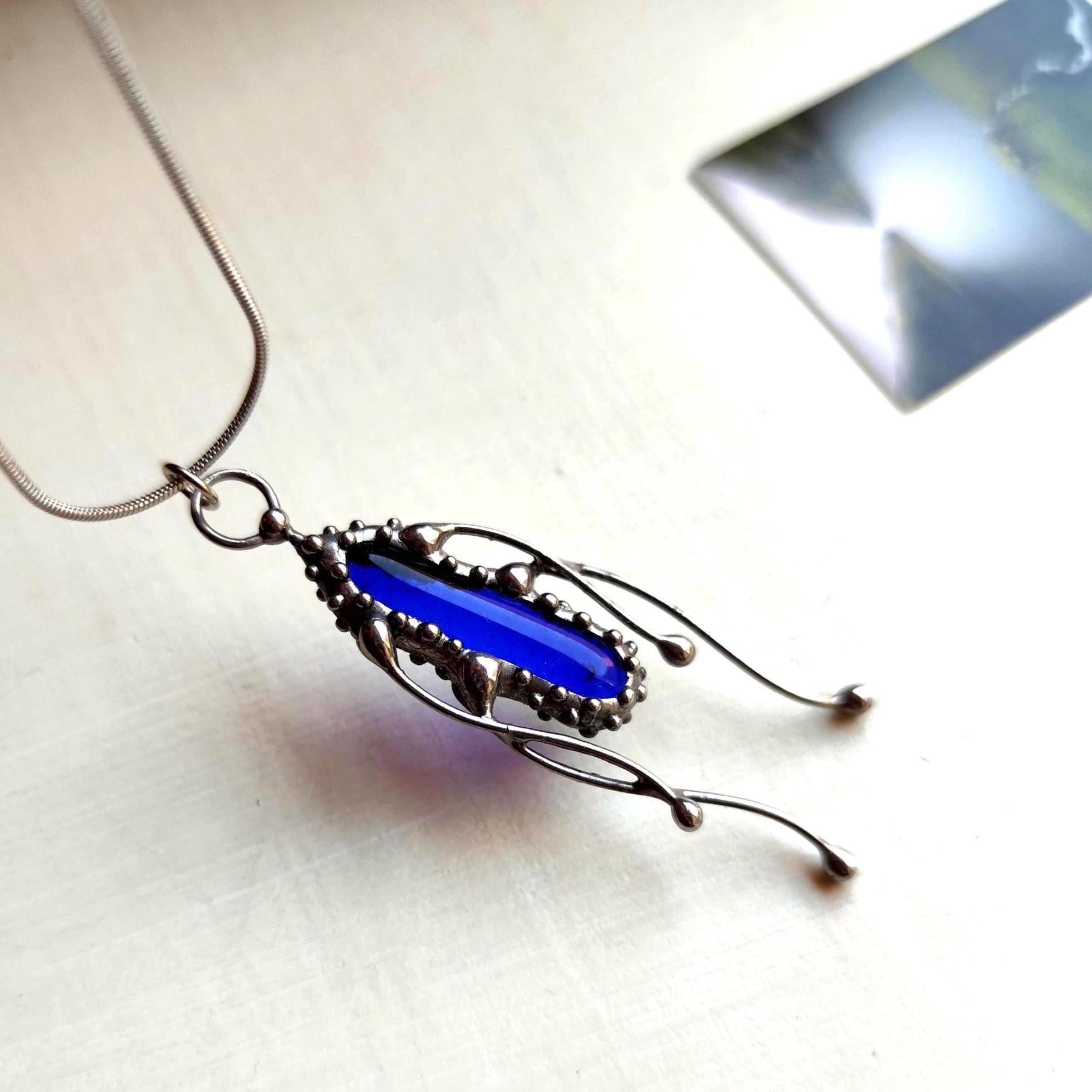Octopus blue stained glass necklace pendant handcrafted from copper, pewter, steel, blue glass. Pendant is light and sturdy. All elements are handmade, which ensures the individuality of each product made in the Yadovito workshop. The copper alloy is polished with a finishing solution to give the jewelry a noble appearance and at the same time so that the metal does not oxidize. Length depends on your choice. Size about 5 * 1.7 cm (2 * 0.6 in). Color silver/blue.