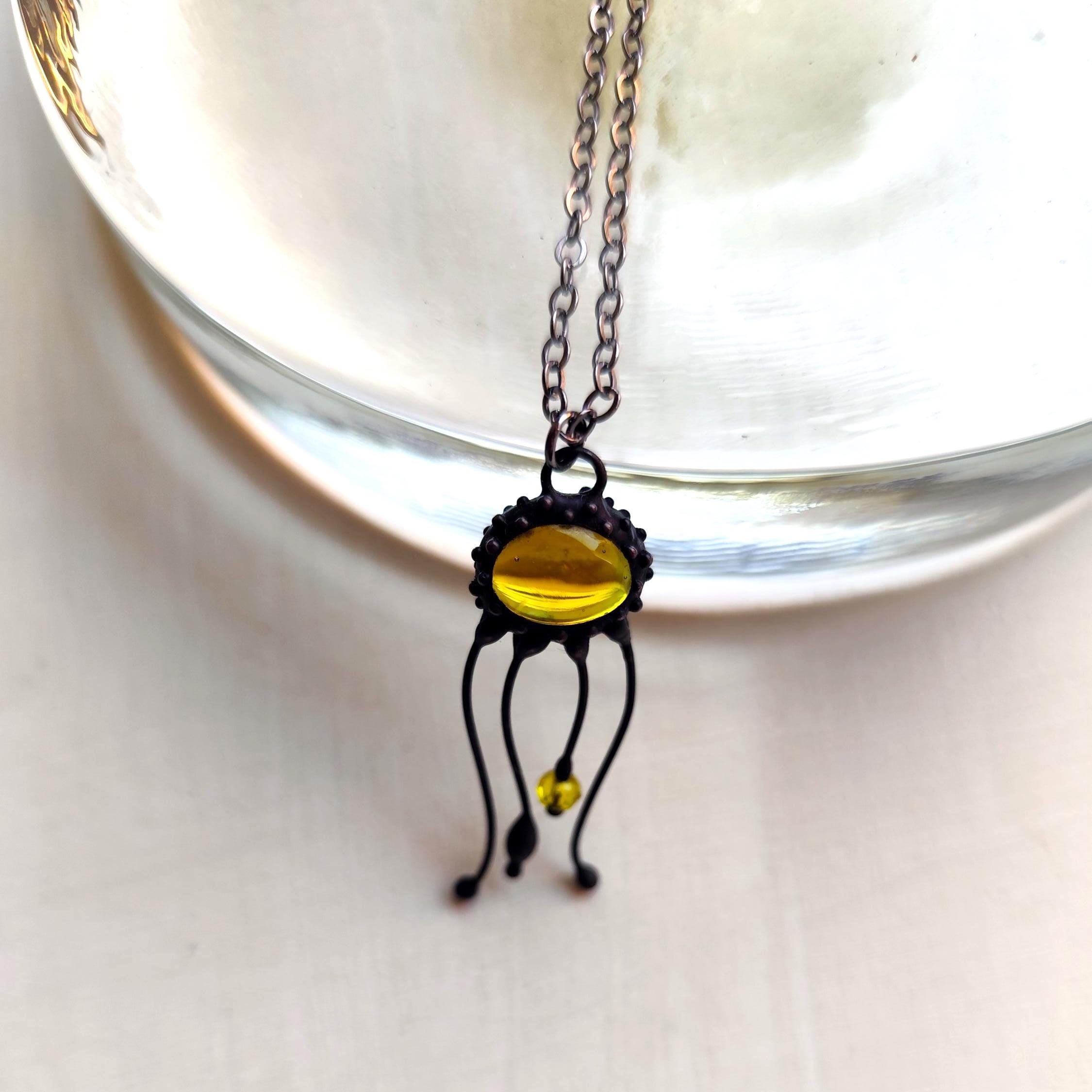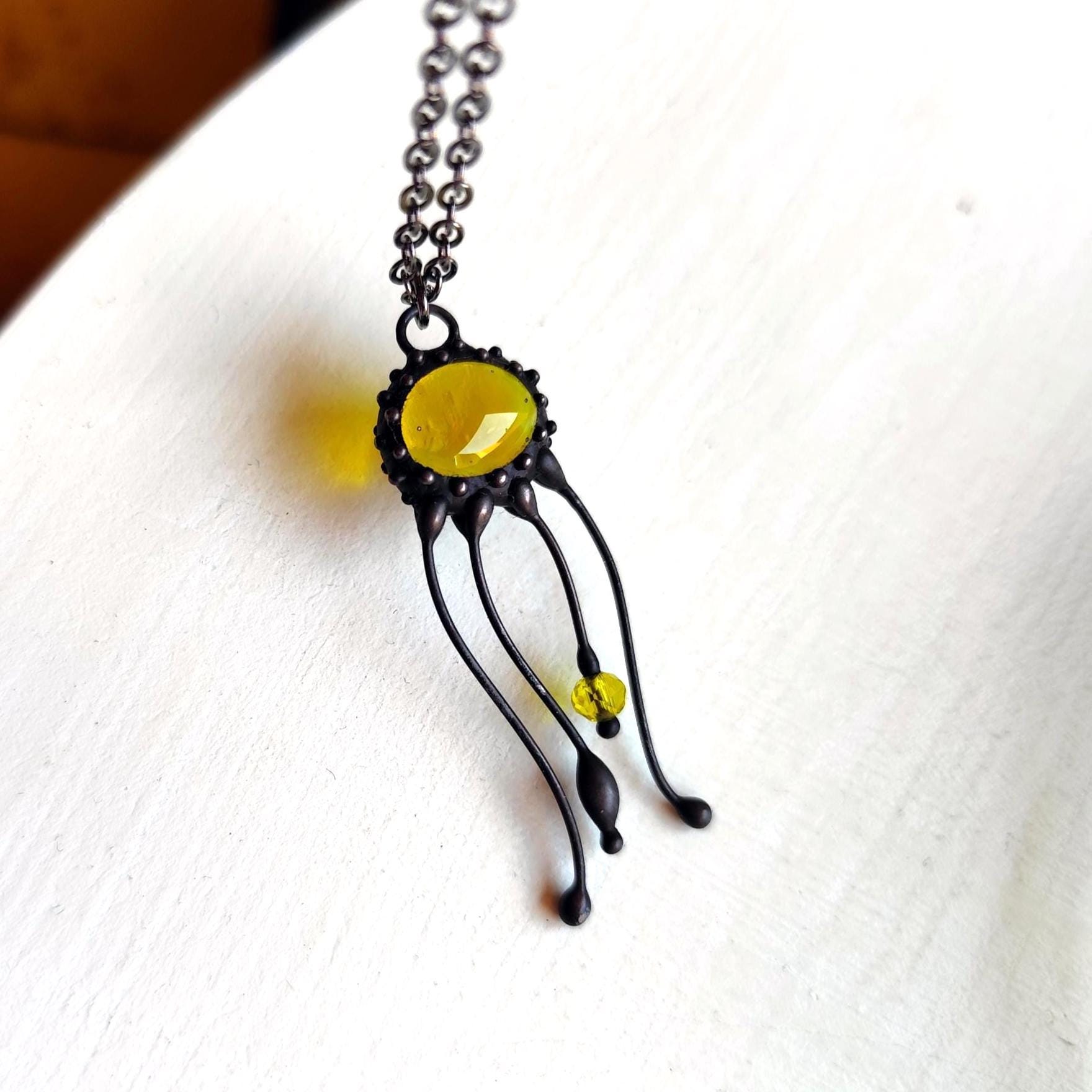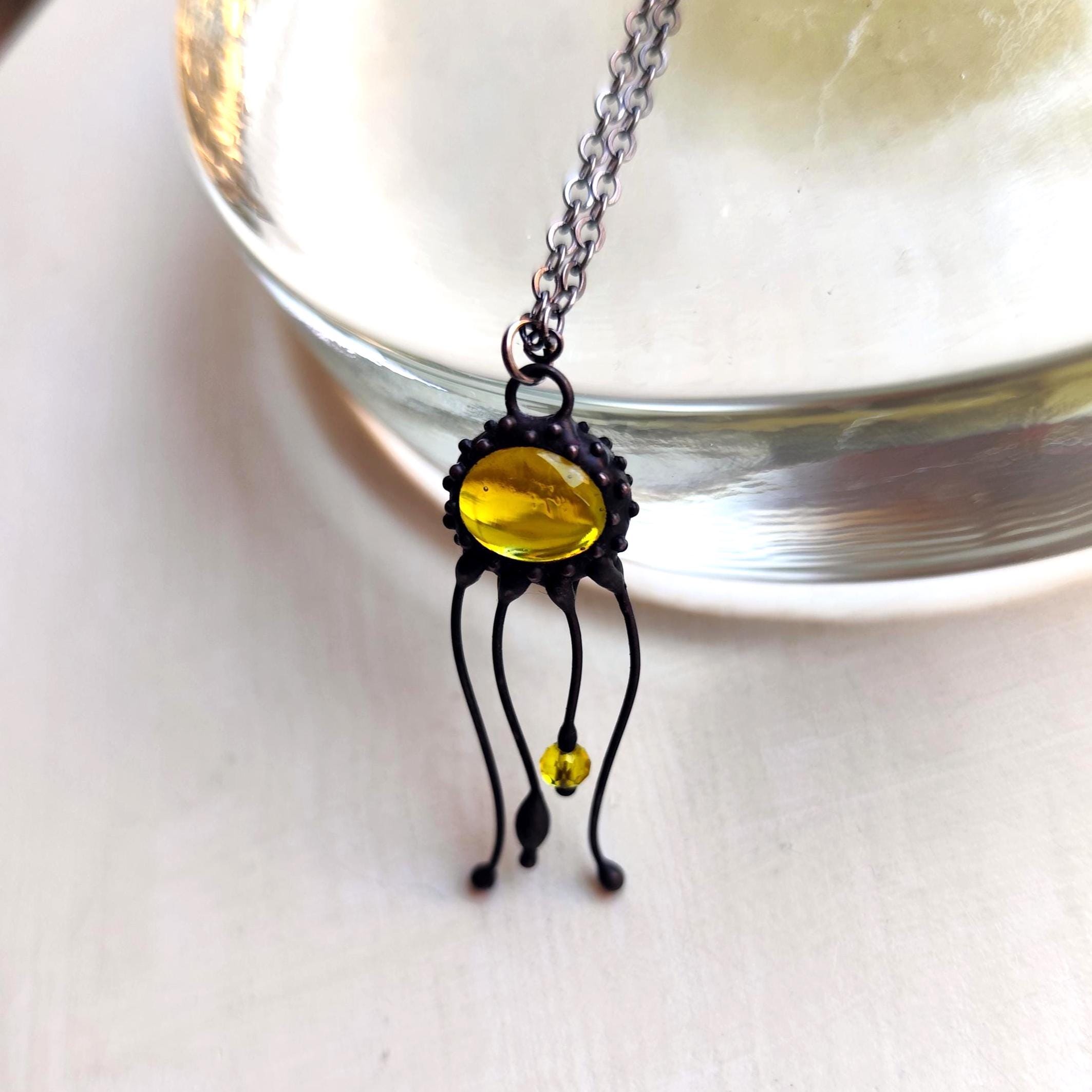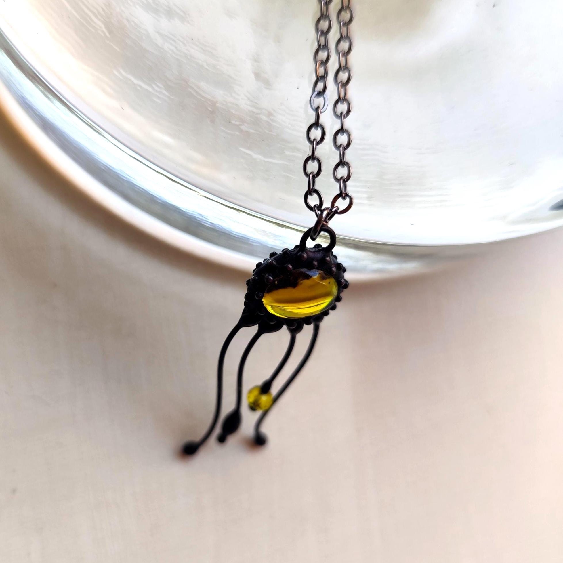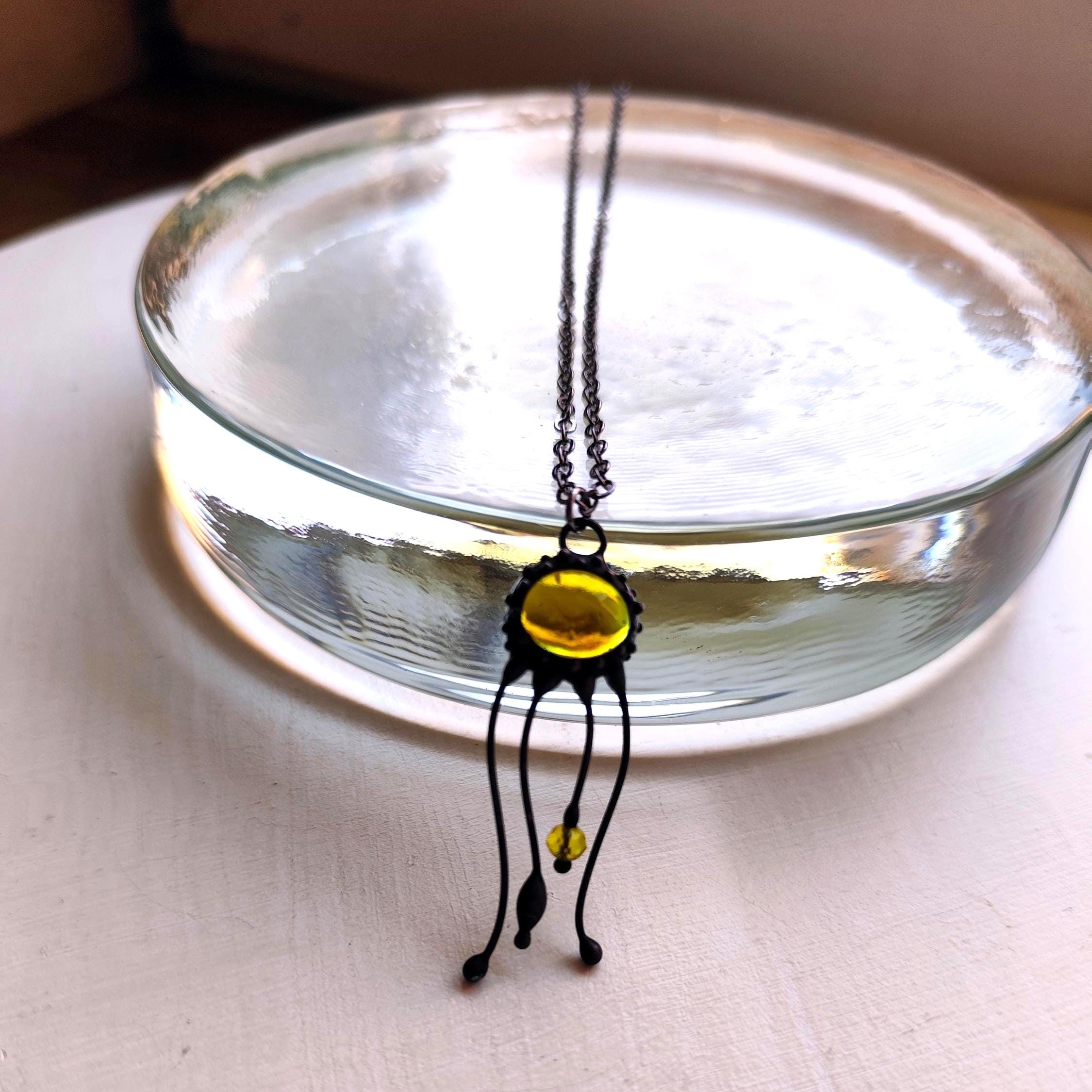 Ocean creatures jellyfish stained glass necklace handcrafted from copper, pewter, steel and yellow glass. This unusual octopus suncatcher pendant is light, sturdy and comfortable to wear. All elements are handmade in the Yadovito workshop, which ensures the individuality of each piece. The copper alloy is covered with patina and polished with a special finishing solution to give the jewelry a noble appearance and protect the metal from oxidizing. Size approx. 4.5 × 1 cm (1.8 × 0.4 in). Color: black and yellow.