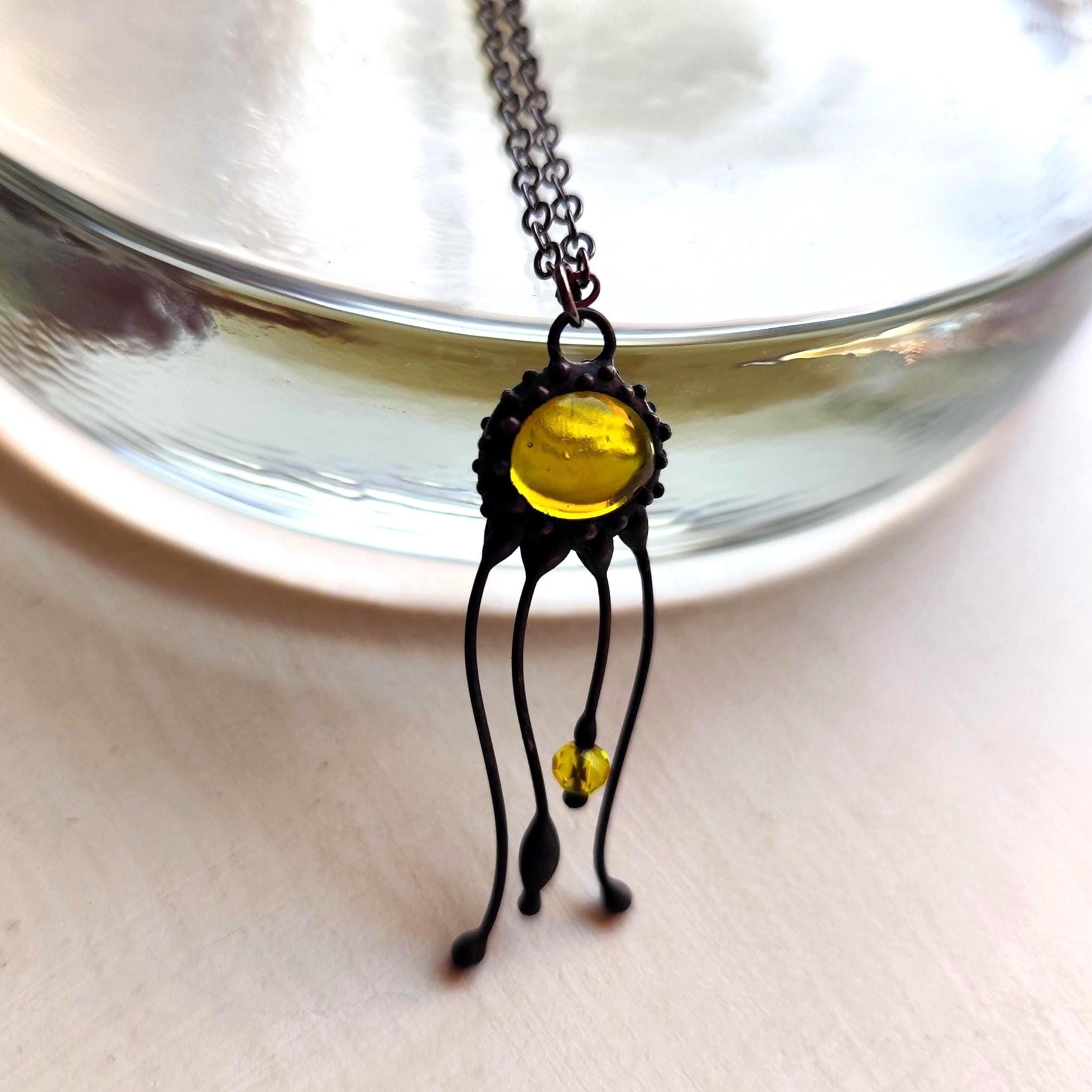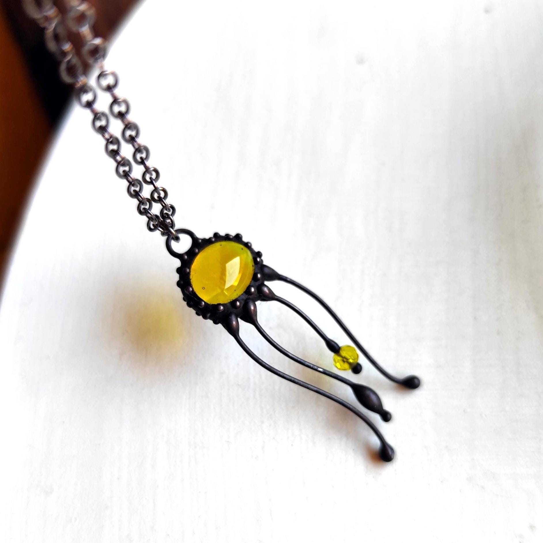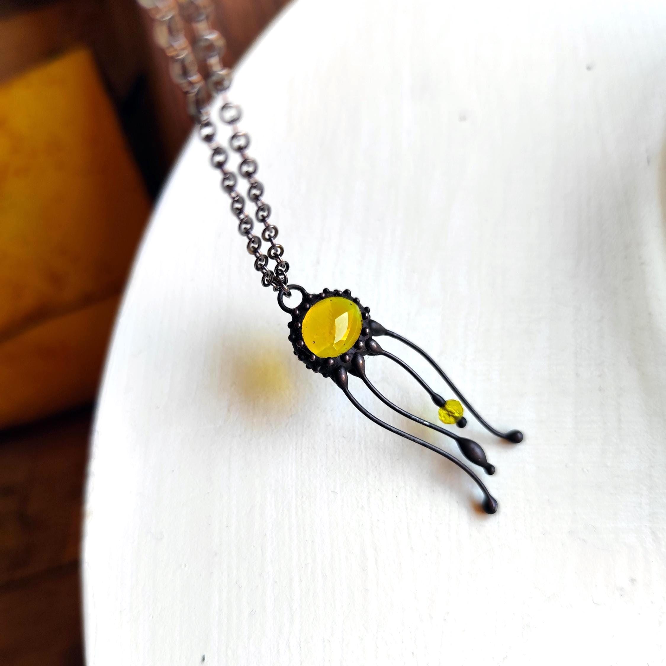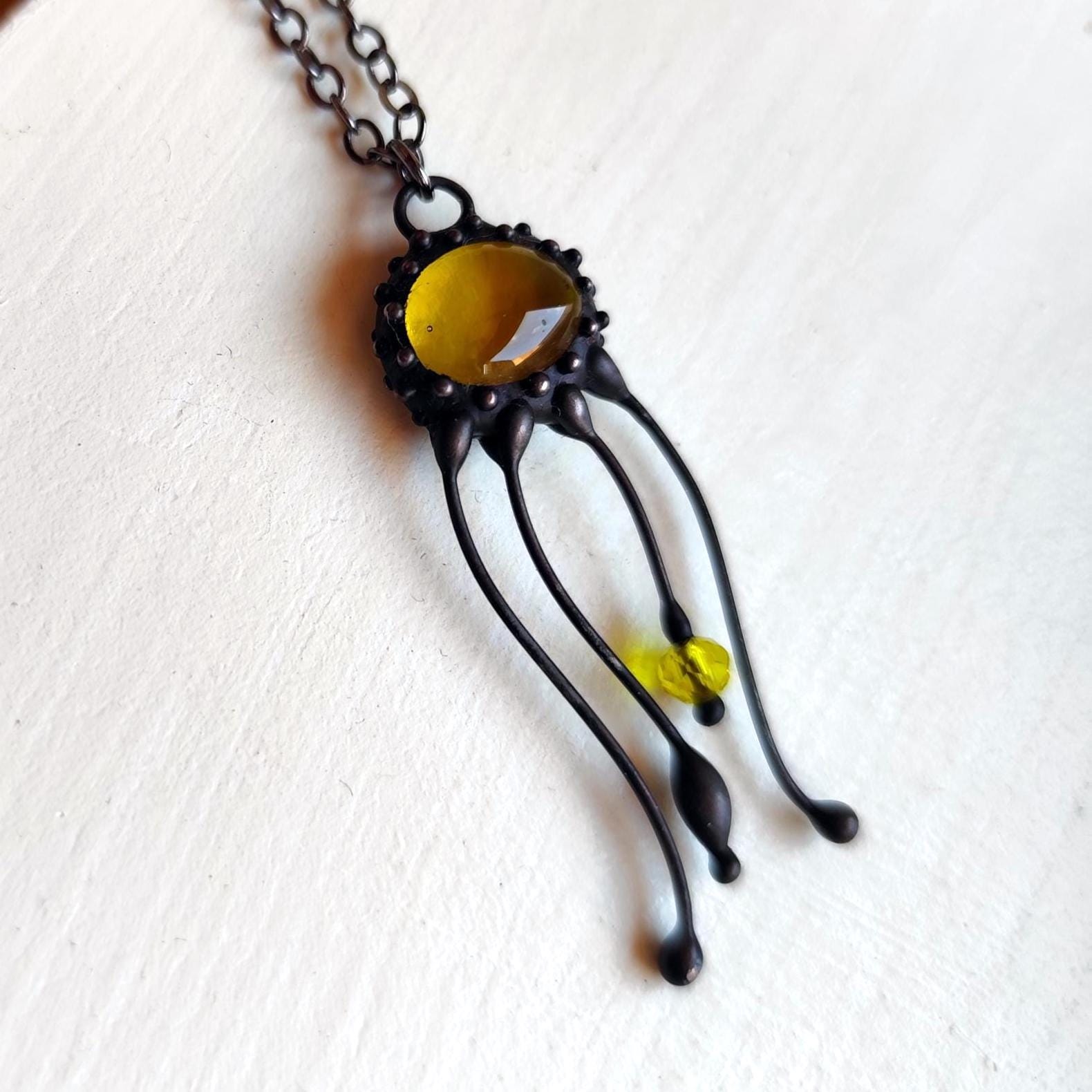 Ocean creatures jellyfish stained glass necklace handcrafted from copper, pewter, steel and yellow glass. This unusual octopus suncatcher pendant is light, sturdy and comfortable to wear. All elements are handmade in the Yadovito workshop, which ensures the individuality of each piece. The copper alloy is covered with patina and polished with a special finishing solution to give the jewelry a noble appearance and protect the metal from oxidizing. Size approx. 4.5 × 1 cm (1.8 × 0.4 in). Color: black and yellow.