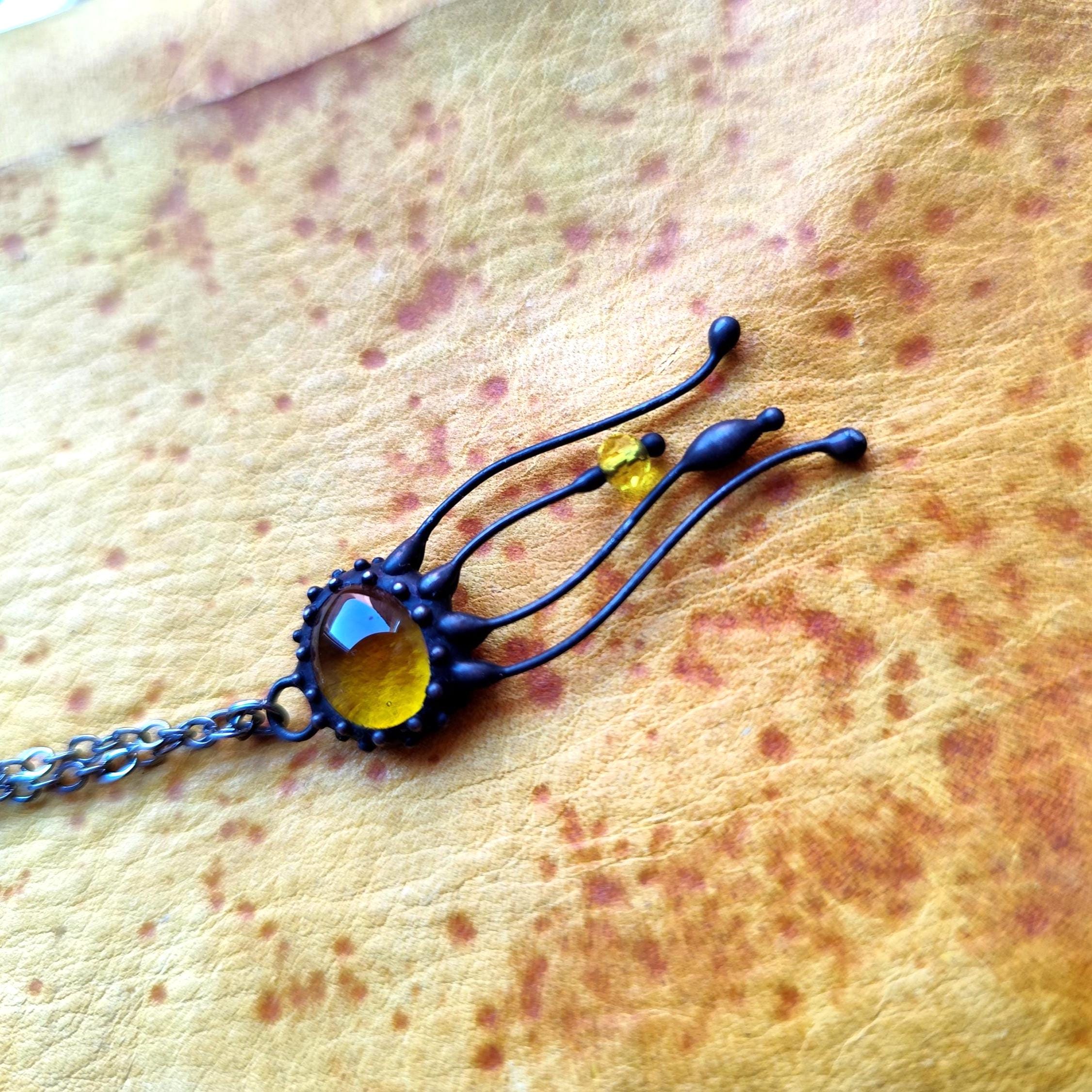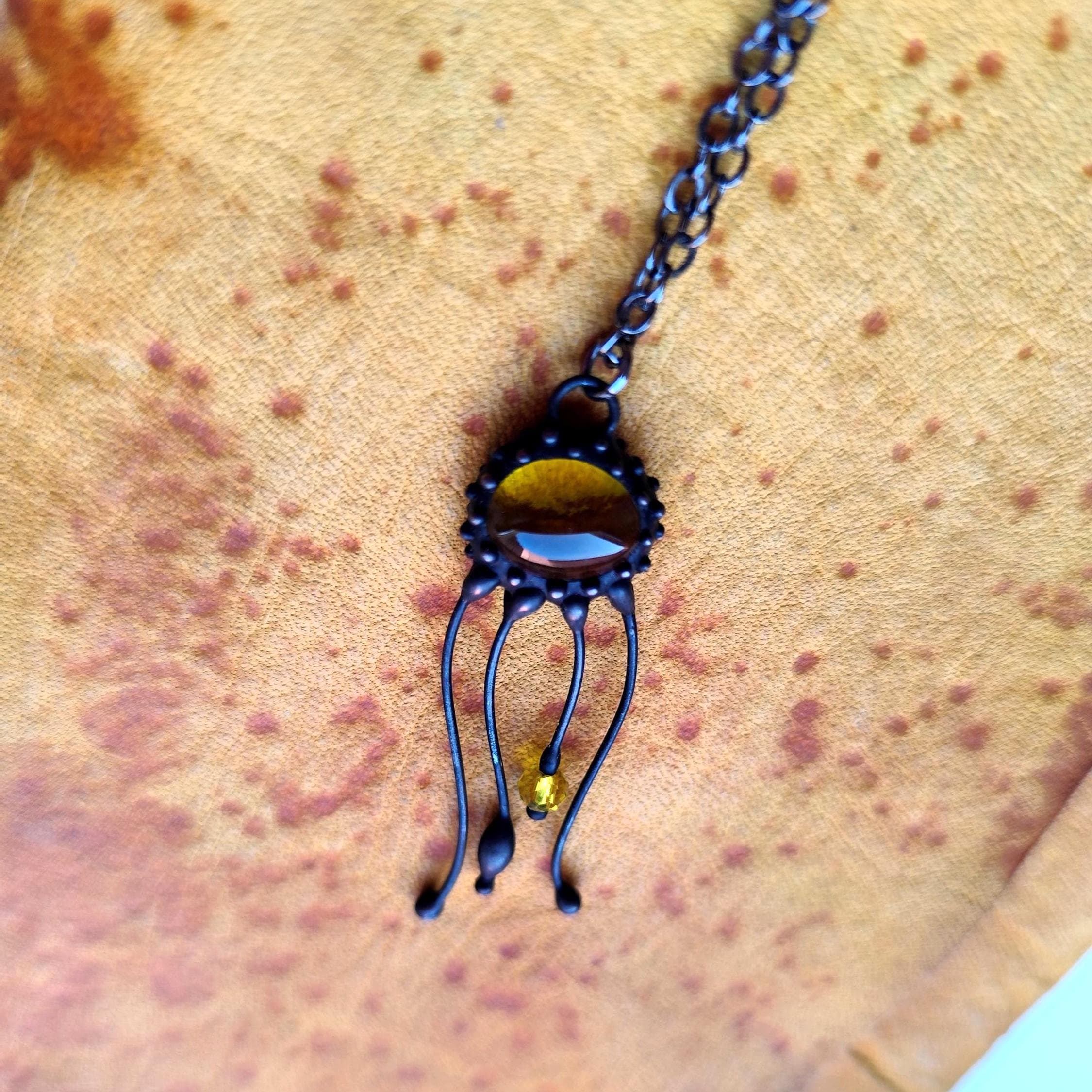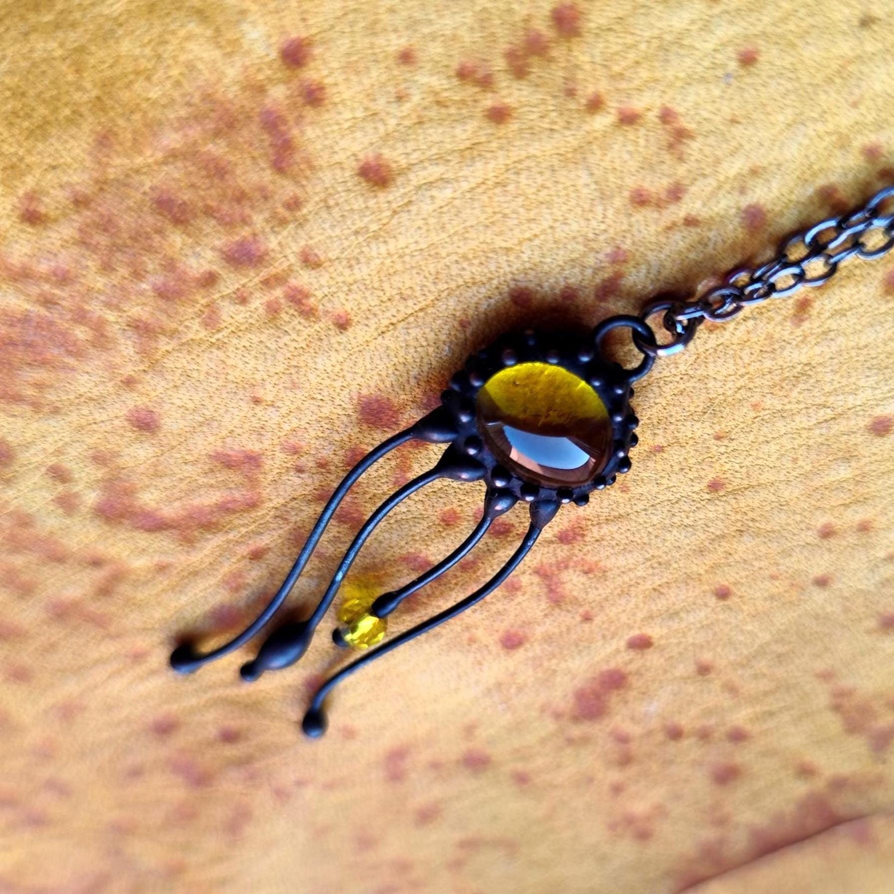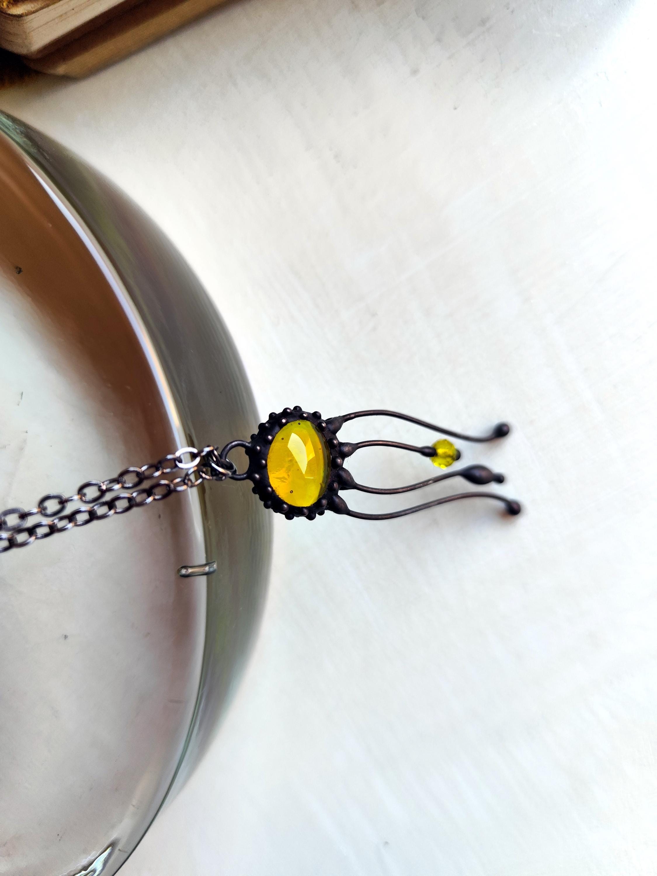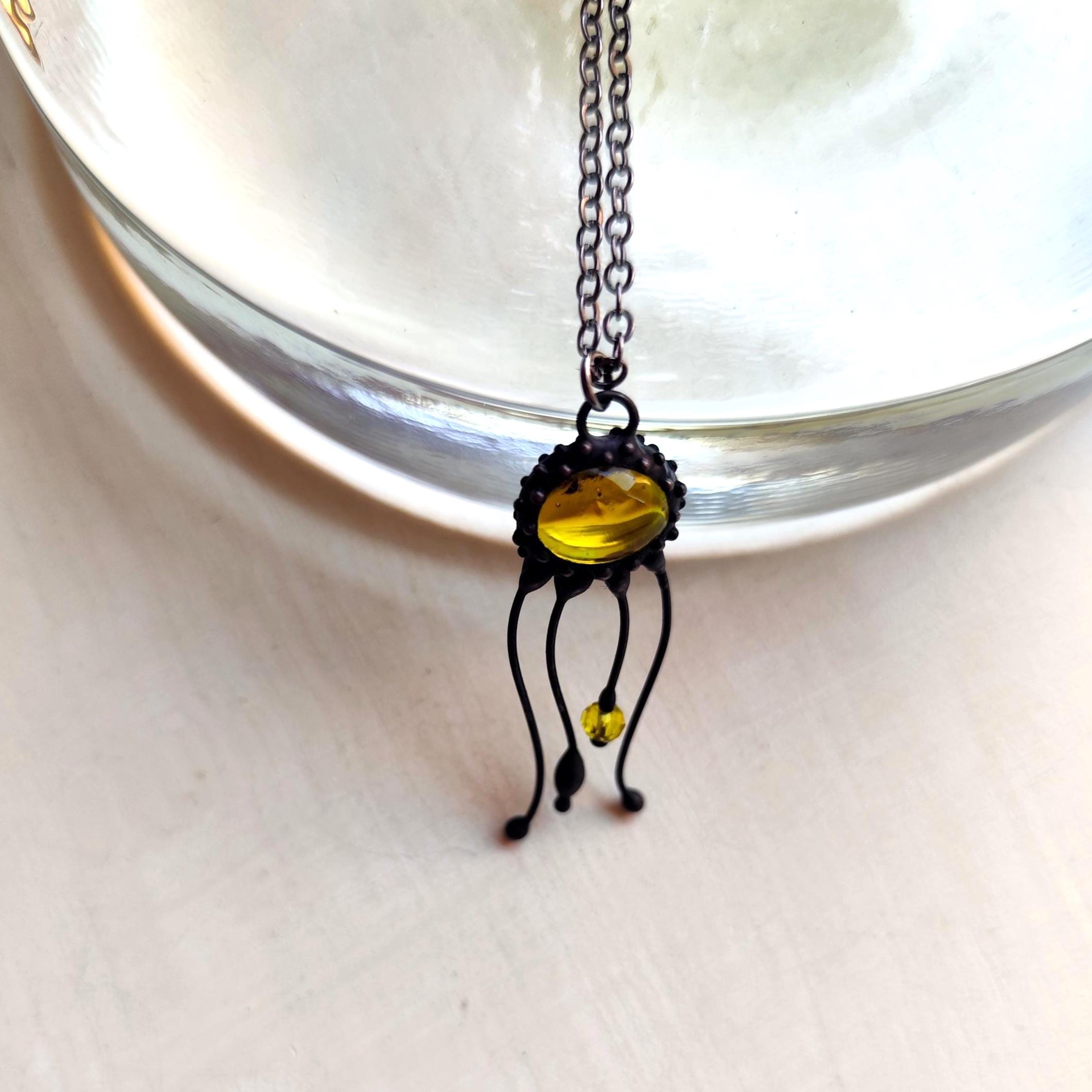 Ocean creatures jellyfish stained glass necklace handcrafted from copper, pewter, steel and yellow glass. This unusual octopus suncatcher pendant is light, sturdy and comfortable to wear. All elements are handmade in the Yadovito workshop, which ensures the individuality of each piece. The copper alloy is covered with patina and polished with a special finishing solution to give the jewelry a noble appearance and protect the metal from oxidizing. Size approx. 4.5 × 1 cm (1.8 × 0.4 in). Color: black and yellow.