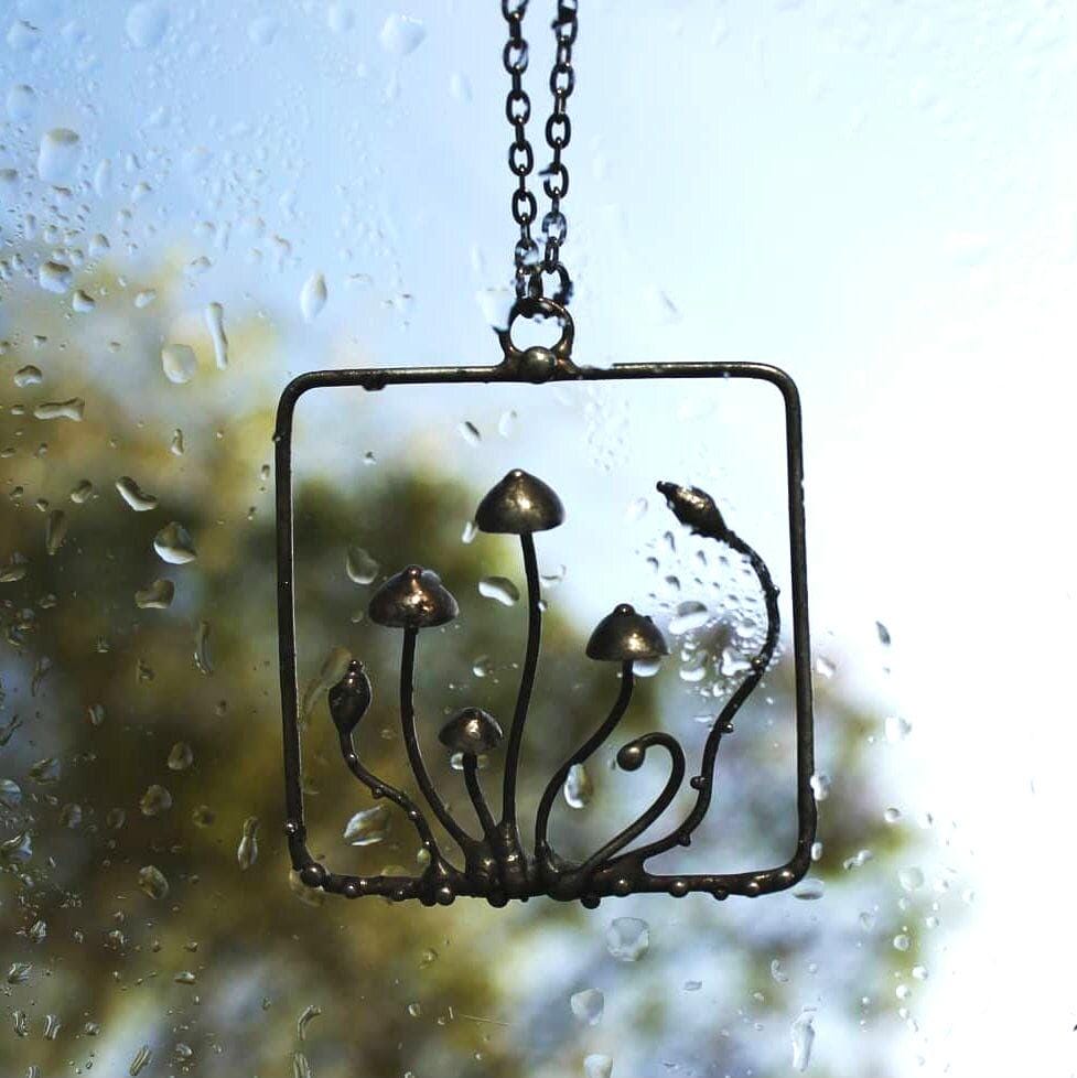 Witch's forest square necklace psilocybe mushrooms handmade from copper, steel, pewter. Covered in black patina and treated with antioxidant. The pendant is light and strudy. All elements are handmade, which ensures the individuality of each product made in the Yadovito workshop. The tin-copper alloy is coated with a black patina to color the metal black, polished with a finishing solution to give the jewelry a noble appearance and at the same time so that the metal does not oxidize. Each jewelry looks individually, because mushroom caps are made by hand, and not cast or stamped. Size about 4 cm (1.6 in). Color black.