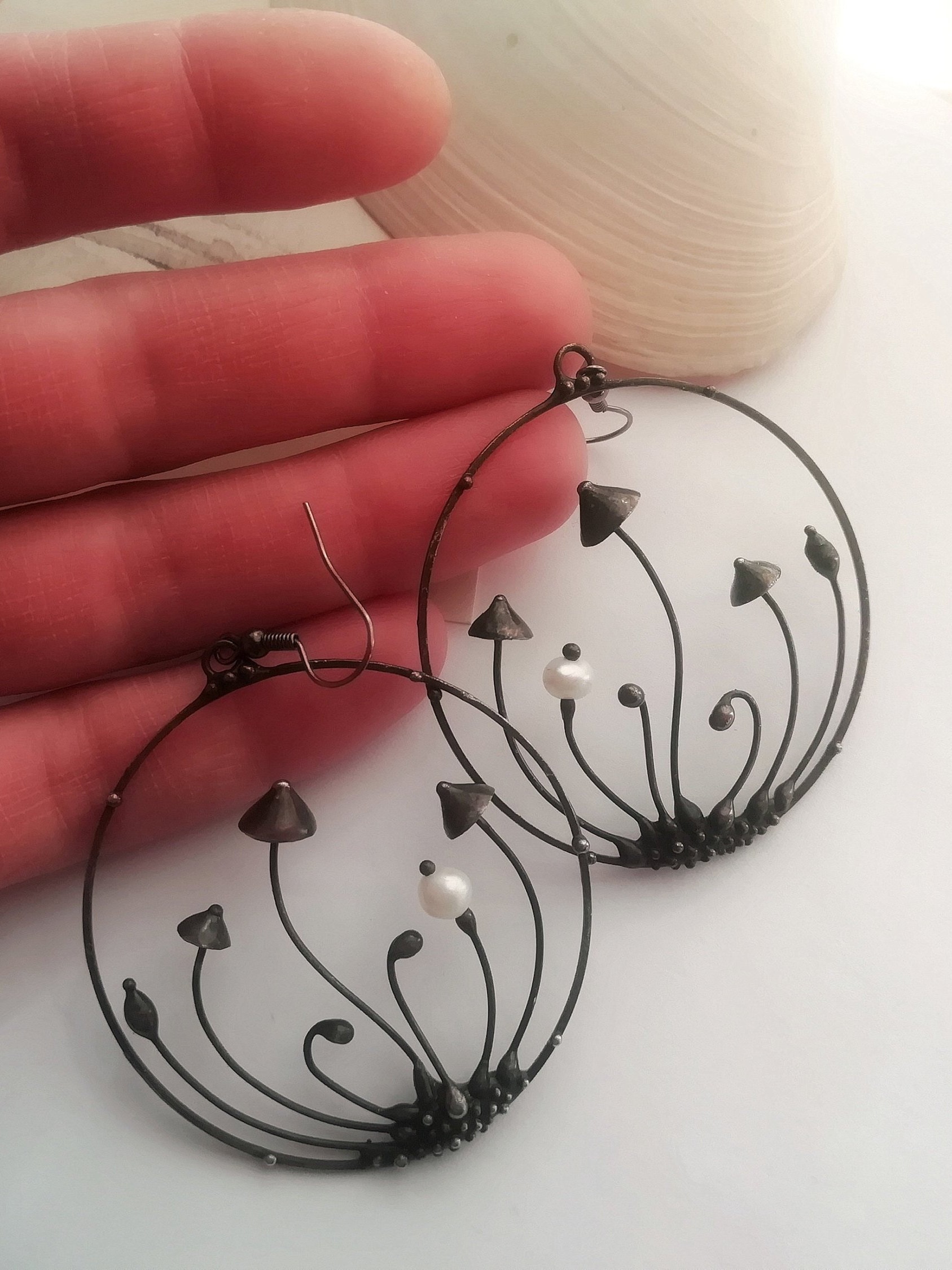 Handcrafted with care, these Mushroom Magic Hoop Earrings are a stunning addition to any jewelry collection. Made from a combination of copper, pewter, steel, and pearl, these earrings have been skillfully crafted in the Yadovito workshop to ensure individuality and quality. The patina treatment and sanding process give the earrings a unique, psychedelic appearance while also providing antioxidant protection. Finished off with a polishing solution to maintain their noble appearance, these earrings are also light and sturdy for comfortable wear. Measuring at approximately 5 cm (2 in), they make the perfect forest-inspired gift for those who appreciate witchy vibes and the beauty of nature. Order yours today and add a touch of magic to your wardrobe.