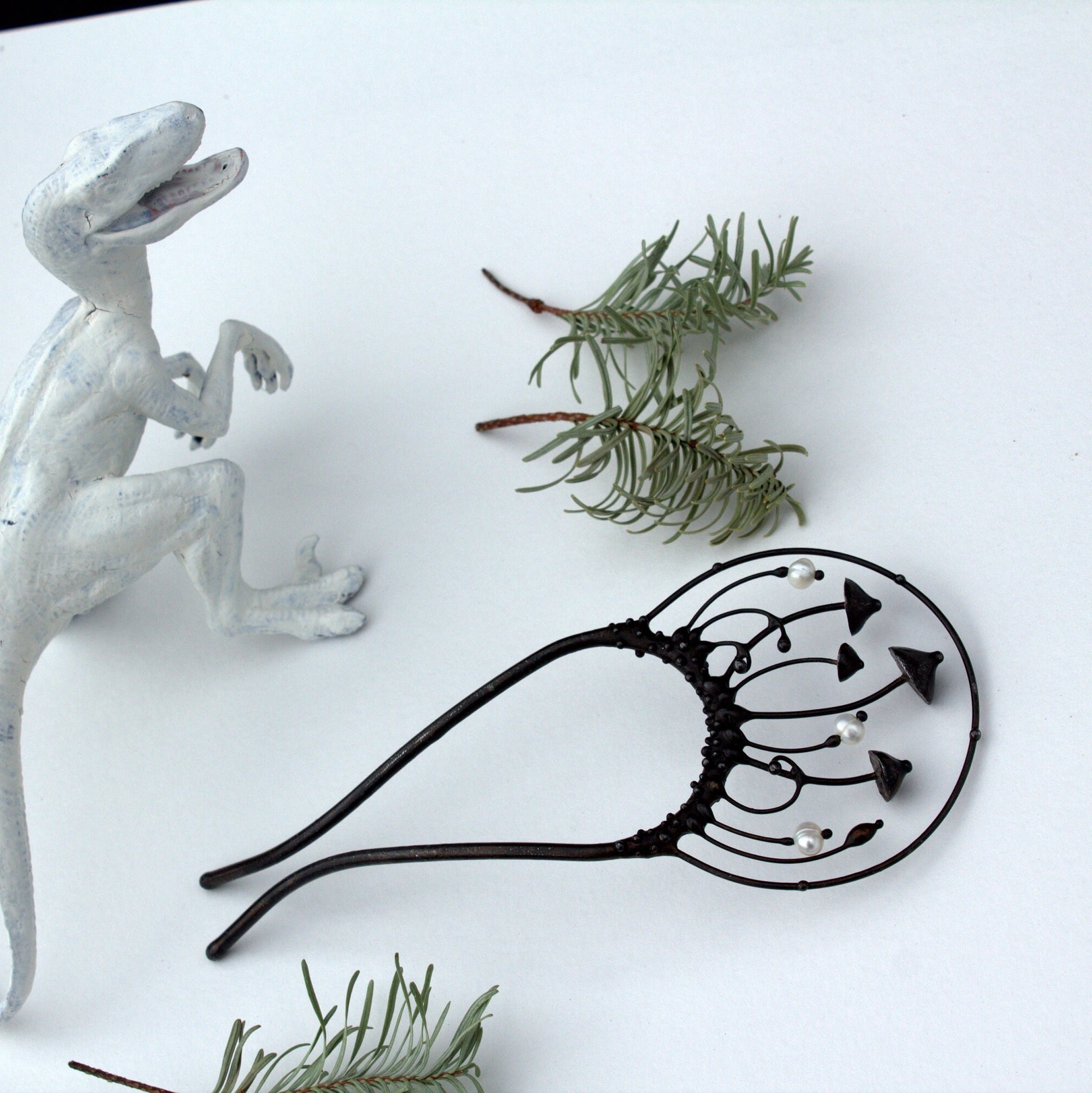 This mushroom hairpin handmade from copper, pewter, steel and pearl. Covered with patina and treated with antioxidant, sanded, polished. Unusual and bright hairpin. All elements are handmade, which ensures the individuality of each product made in the Yadovito workshop. The copper alloy is coated with a black patina to color the metal black, polished with a finishing solution to give the jewelry a noble appearance and at the same time so that the metal does not oxidize. Size about 14.5\6.5 cm (5.7 * 2.5 in). Color black\white.