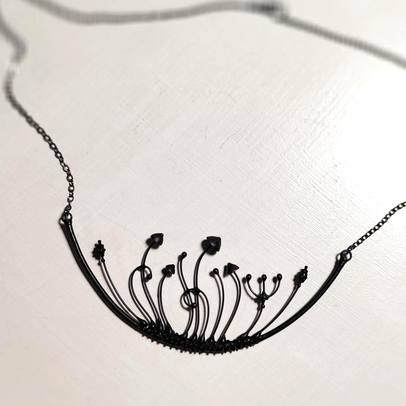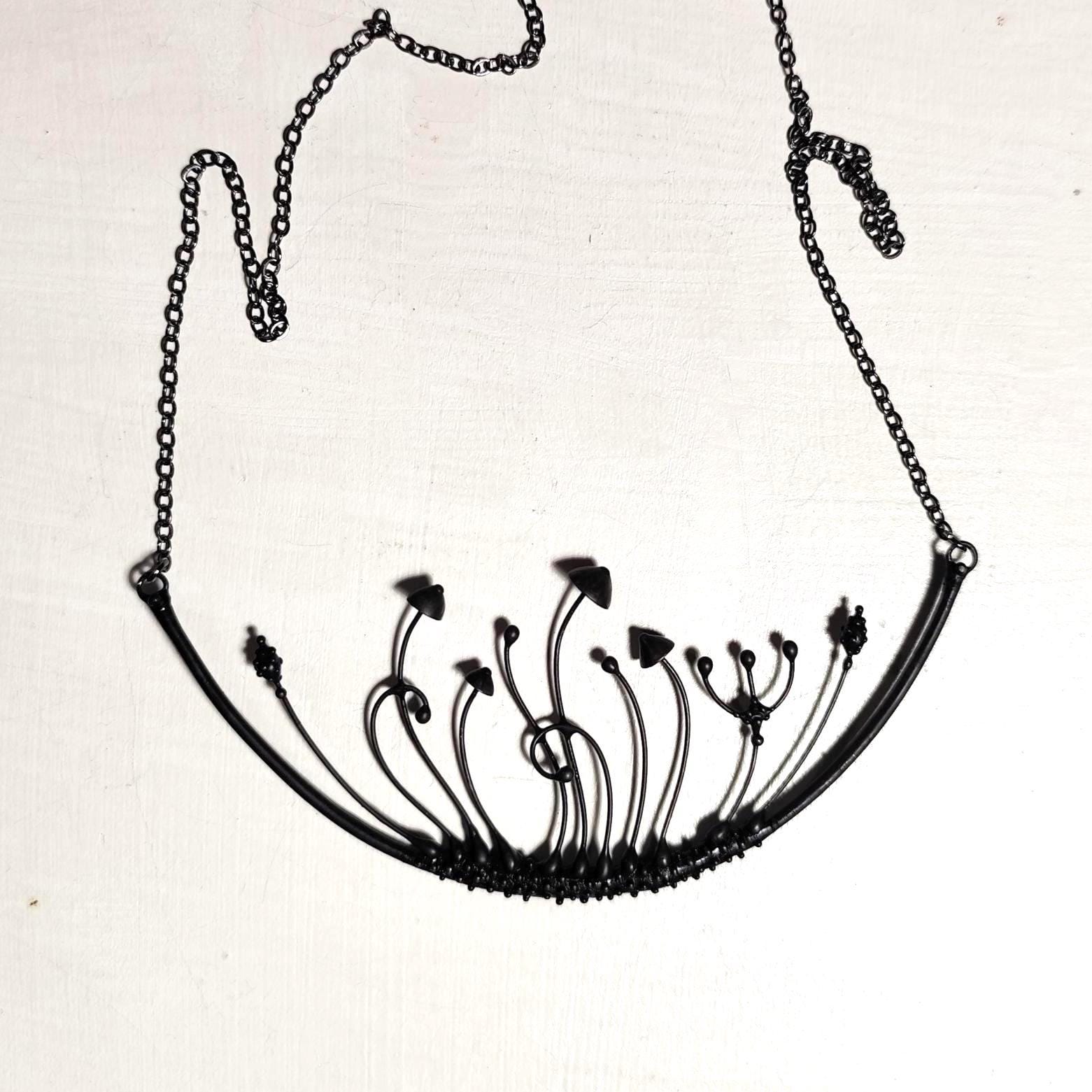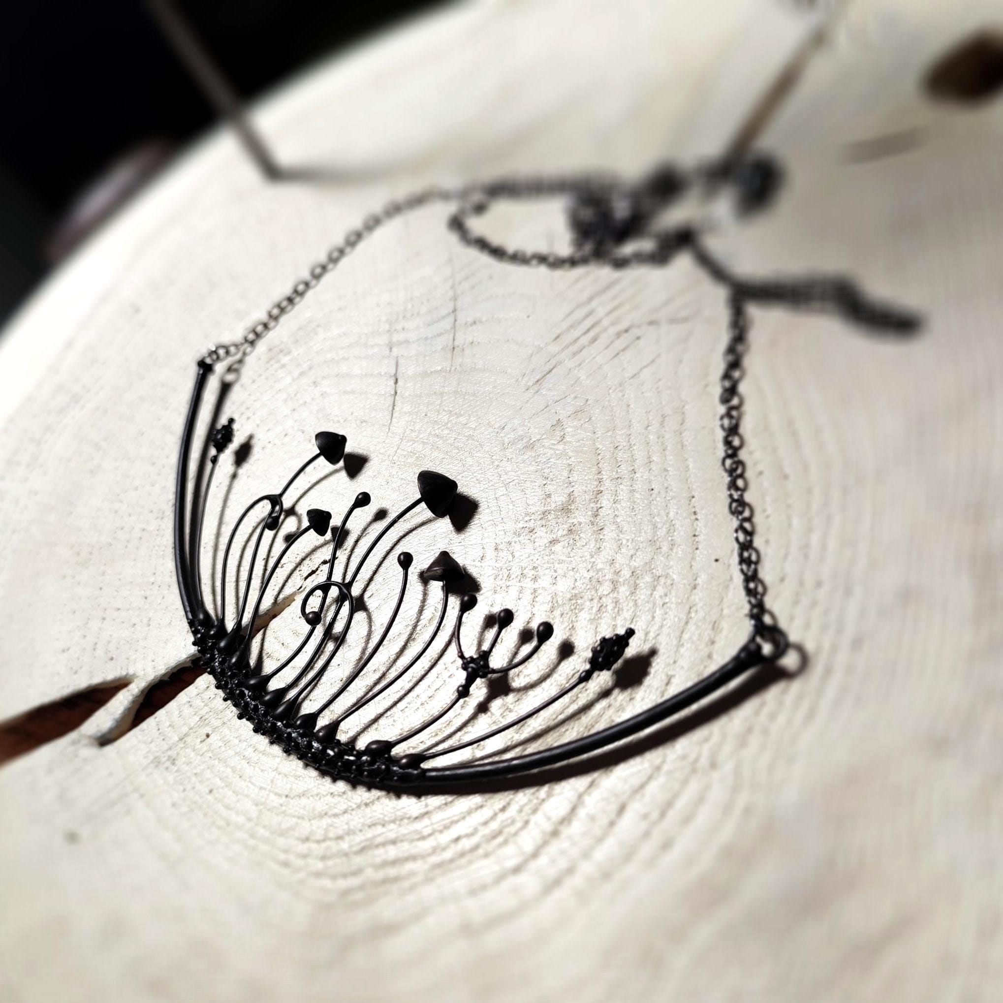 Handmade by Yadovito, this magic mushrooms necklace features a striking arc design in black metal. Made from a mix of copper, pewter alloy, and steel, this necklace is coated in patina and treated with antioxidant to ensure it stays sturdy. Each piece is individually crafted, making every necklace unique. The pewter alloy is polished with a finishing solution to give it a sophisticated look and prevent oxidation. Measuring 6 * 13 cm (2.3 * 5.1 in), this necklace is a statement piece perfect for any boho, forest, avant garde, or witch style.