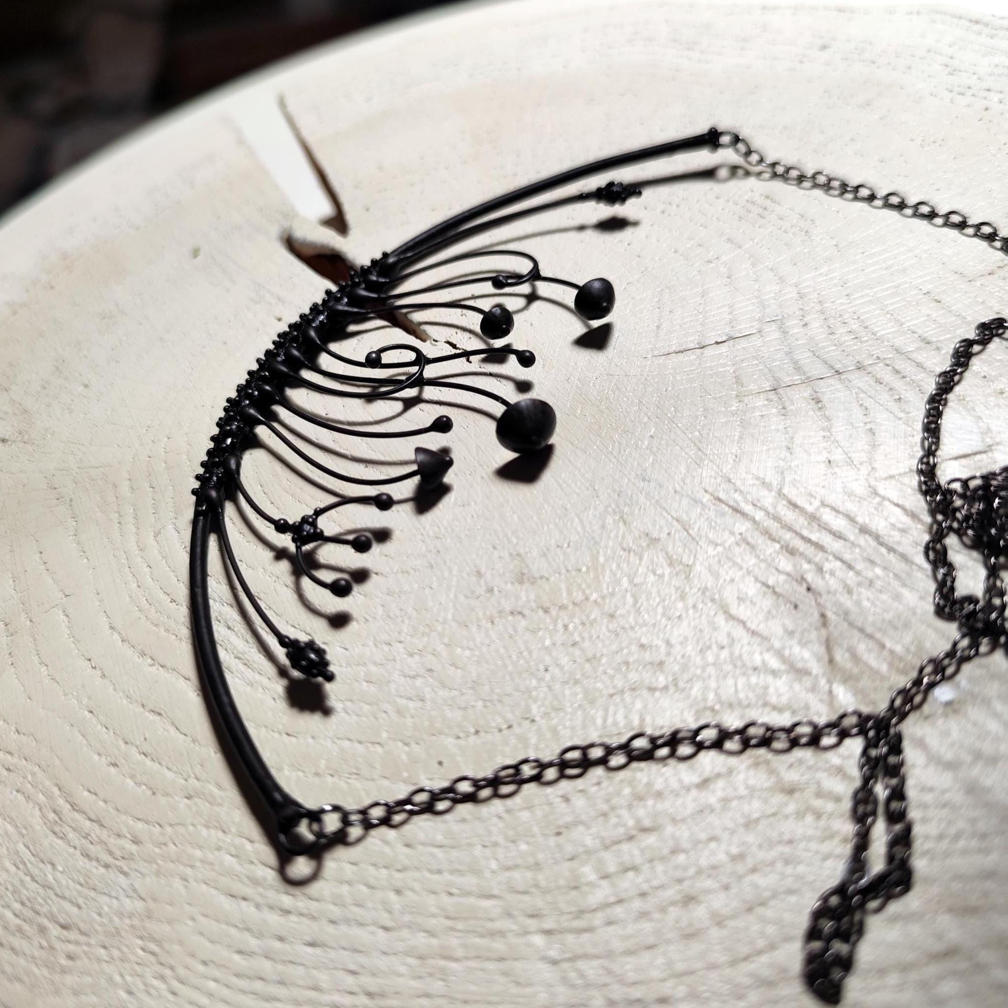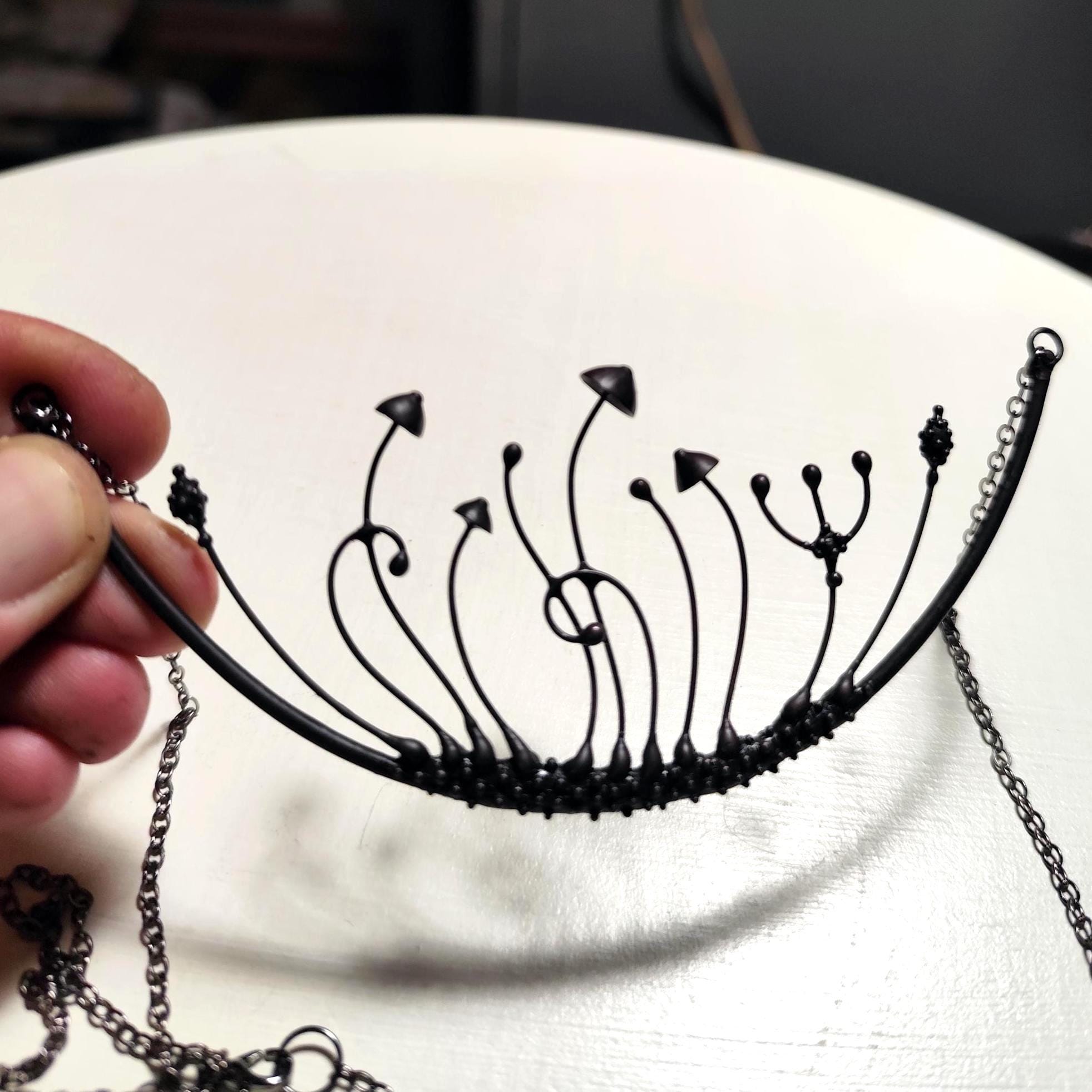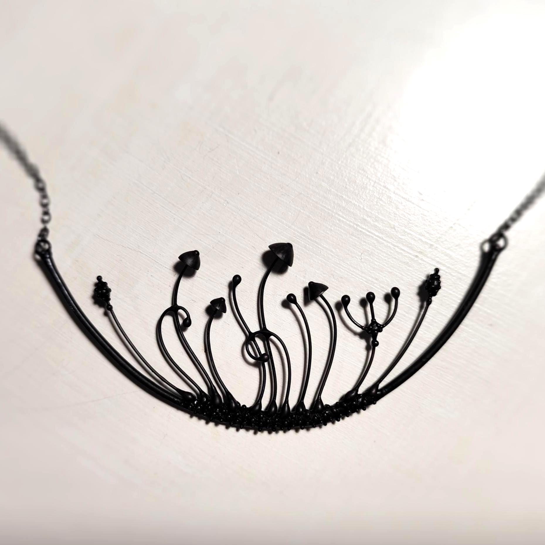 Handmade by Yadovito, this magic mushrooms necklace features a striking arc design in black metal. Made from a mix of copper, pewter alloy, and steel, this necklace is coated in patina and treated with antioxidant to ensure it stays sturdy. Each piece is individually crafted, making every necklace unique. The pewter alloy is polished with a finishing solution to give it a sophisticated look and prevent oxidation. Measuring 6 * 13 cm (2.3 * 5.1 in), this necklace is a statement piece perfect for any boho, forest, avant garde, or witch style.