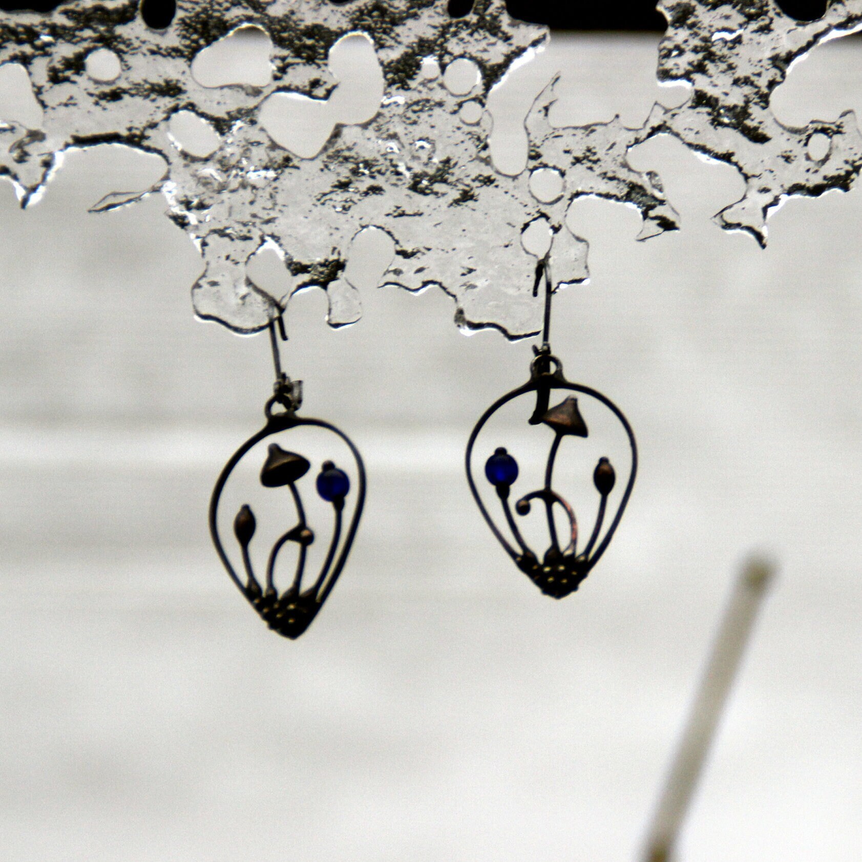This mushrooms drops earrings with blue glass made from copper, pewter, steel, glass. Earrings is light and strong enough. All elements are handmade, which ensures the individuality of each product made in the Yadovito workshop. The copper alloy is coated with a black patina to color the metal black, polished with a finishing solution to give the jewelry a noble appearance and at the same time so that the metal does not oxidize. Each jewelry looks individually, because mushroom caps are made by hand, and not cast or stamped. Size about 3.3/2.3 cm (1.3 * 1 in). Color black/blue.