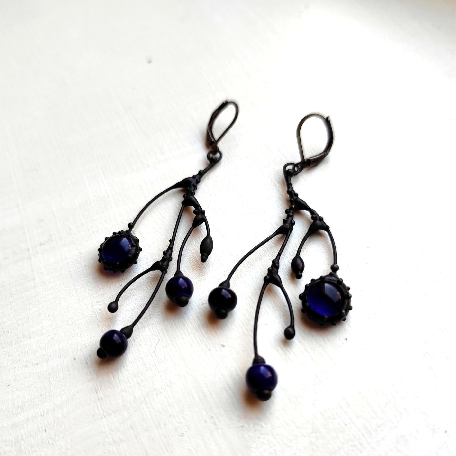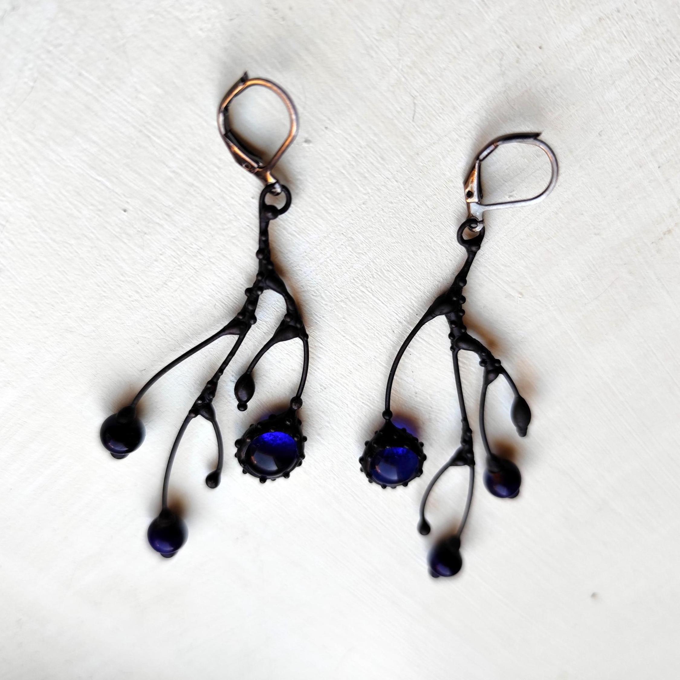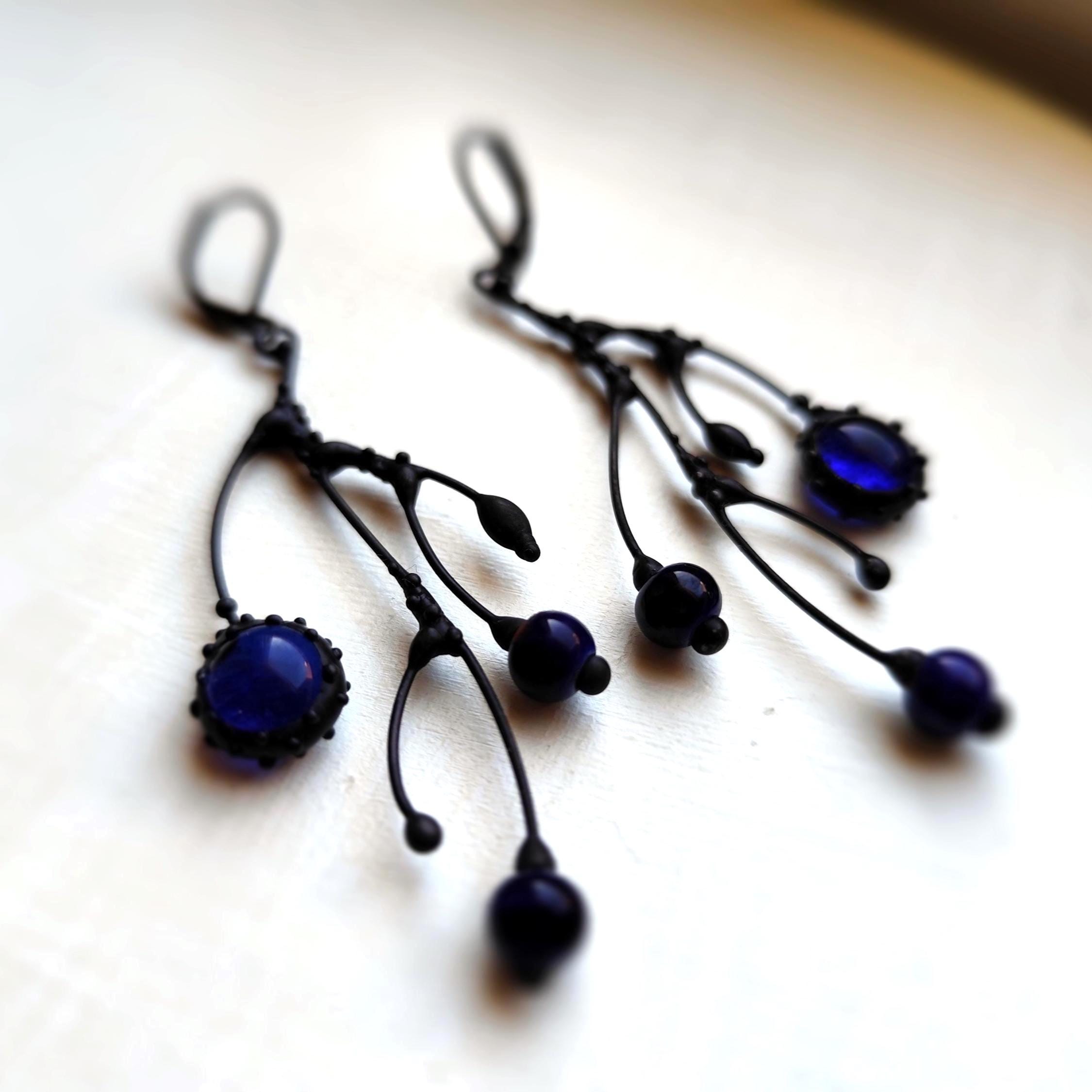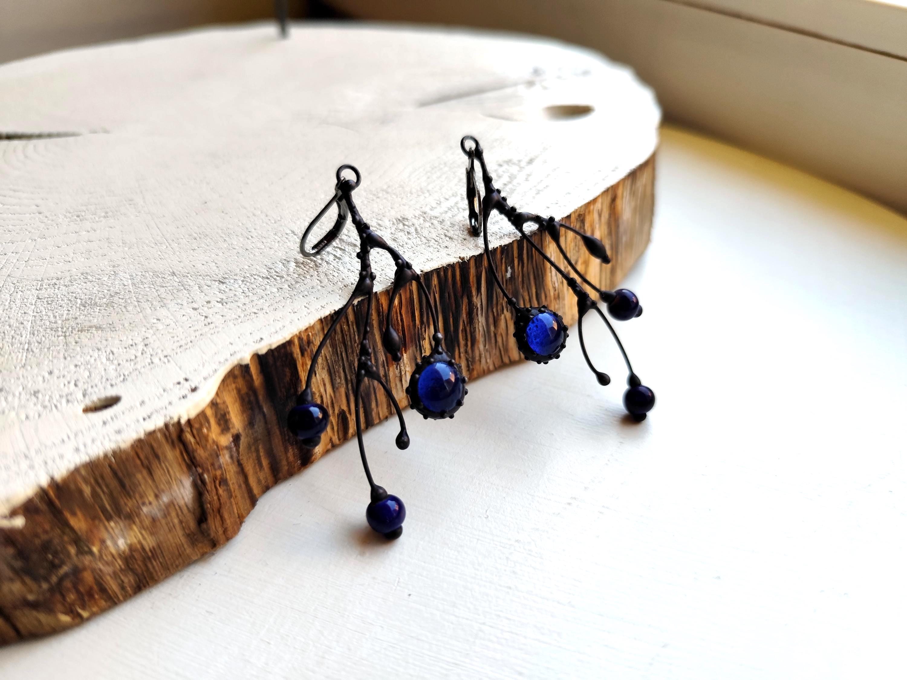 Asymmetrical forest tree branch earrings made from copper, pewter, steel and blue glass. It is are light, thin and asymmetrical. All elements are handmade, which ensures the individuality of each product made in the Yadovito workshop. The copper alloy is coated with a black patina to color the metal black, polished with a finishing solution to give the jewelry a noble appearance and at the same time so that the metal does not oxidize. The earrings use glass melted in a special furnace. After melting, the glass takes on an almost unique shape and amazing color shades that play in the light. Size about 6/3 cm (2.3 * 1.1 in). Color black/blue.