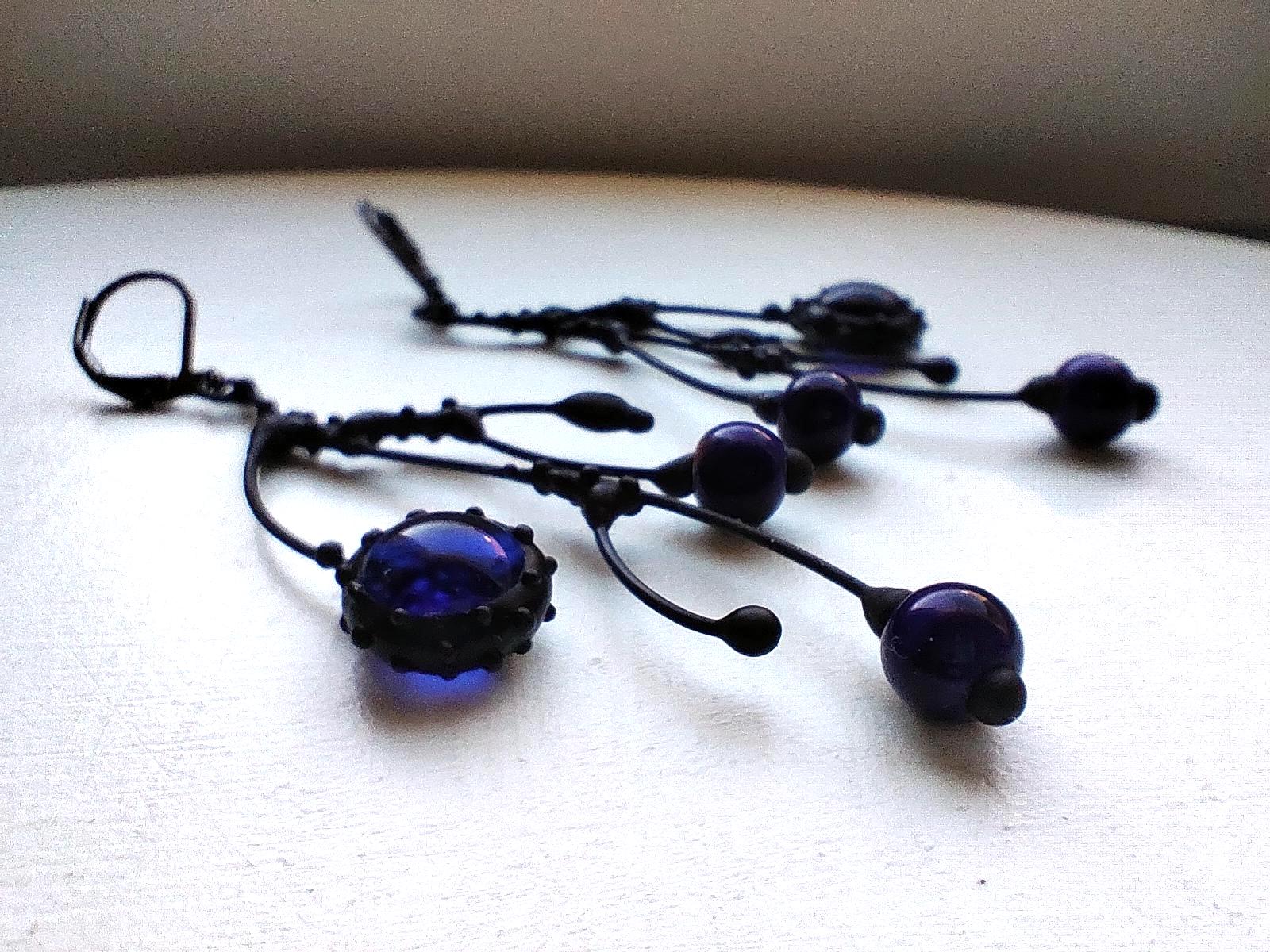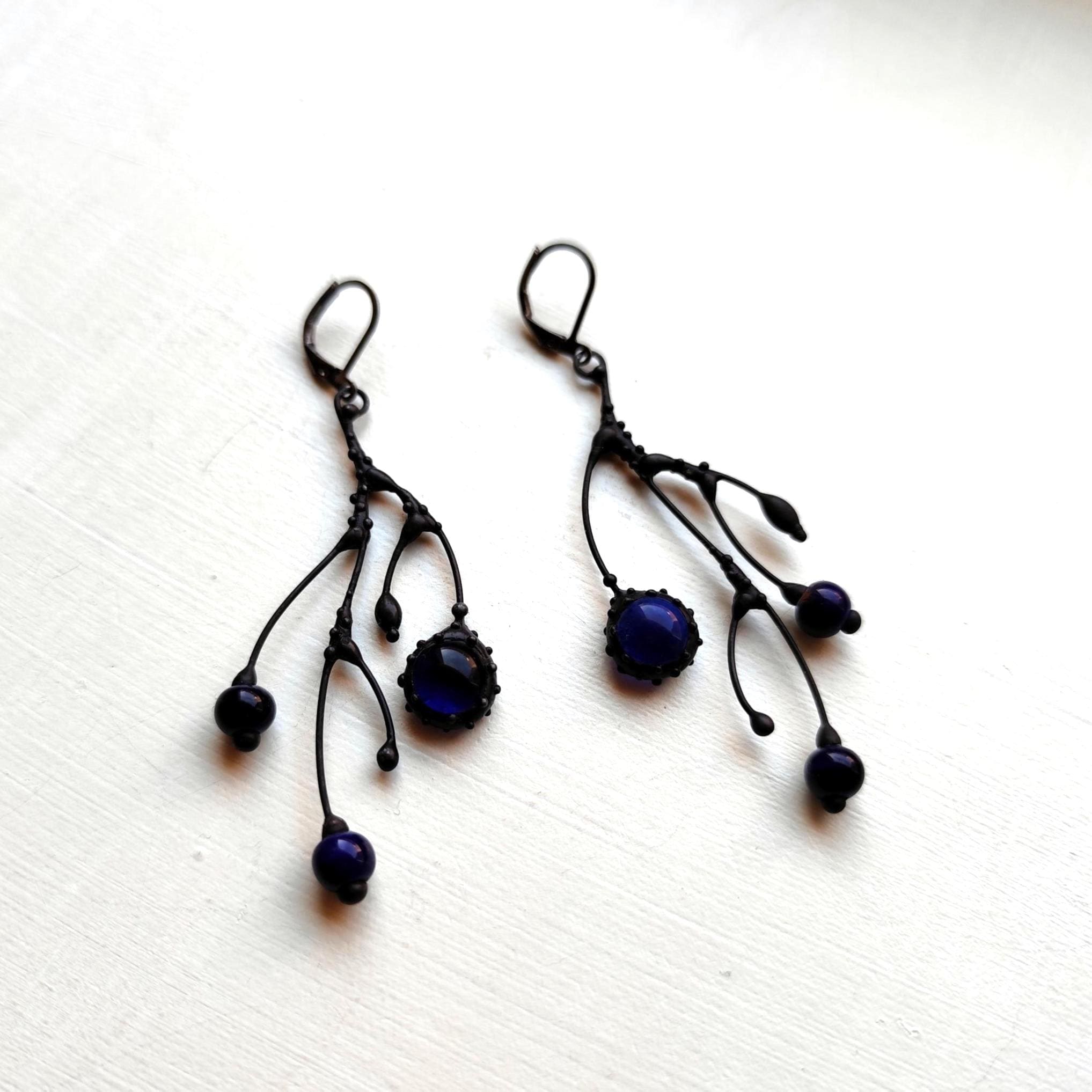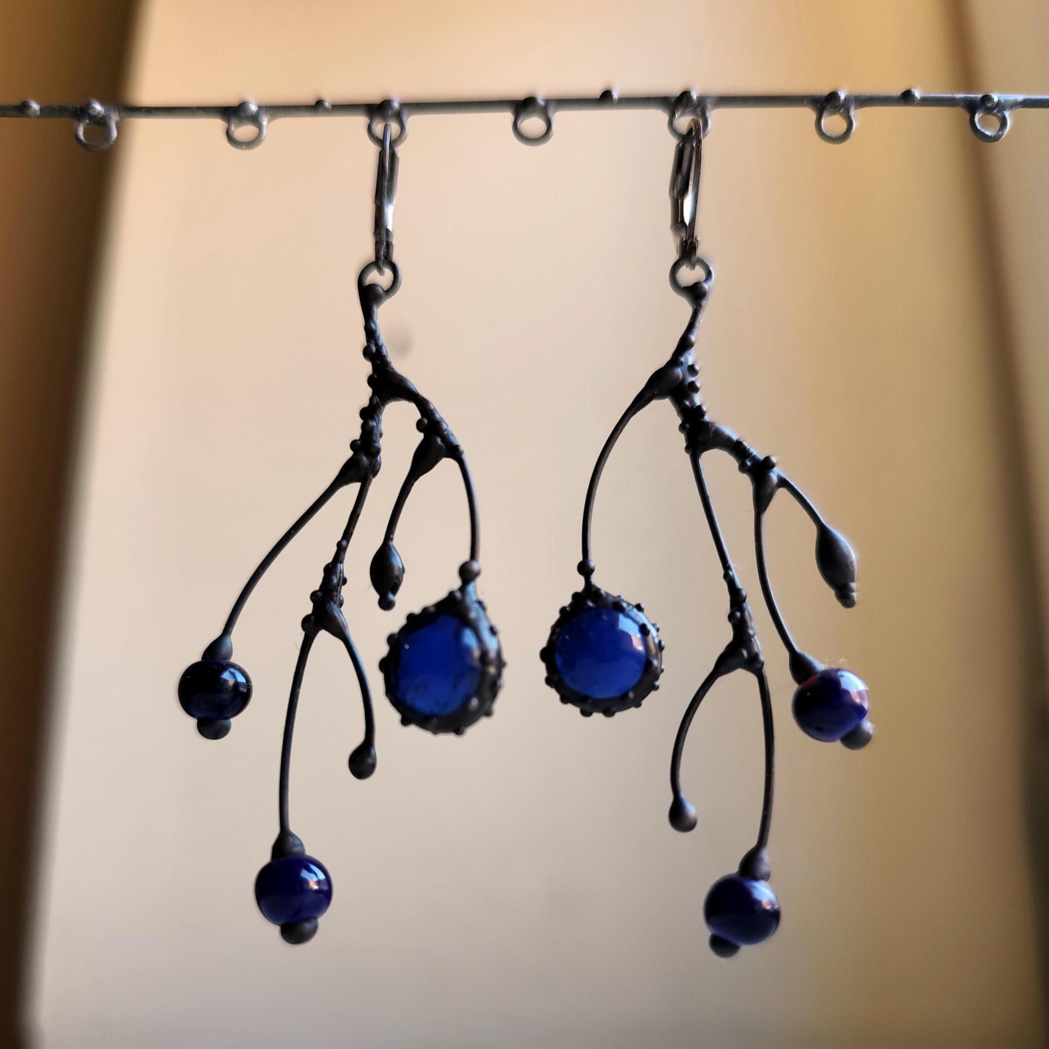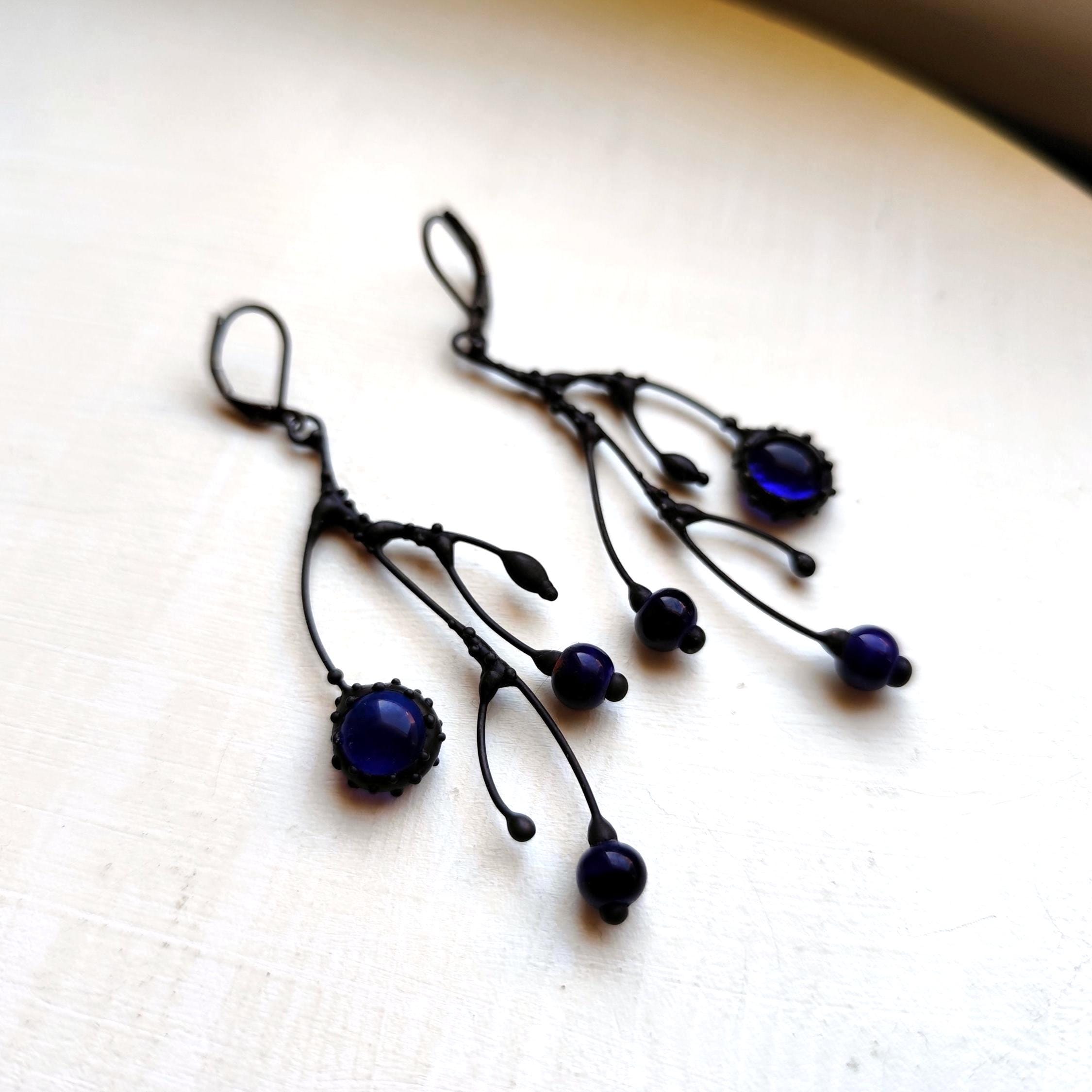 Asymmetrical forest tree branch earrings made from copper, pewter, steel and blue glass. It is are light, thin and asymmetrical. All elements are handmade, which ensures the individuality of each product made in the Yadovito workshop. The copper alloy is coated with a black patina to color the metal black, polished with a finishing solution to give the jewelry a noble appearance and at the same time so that the metal does not oxidize. The earrings use glass melted in a special furnace. After melting, the glass takes on an almost unique shape and amazing color shades that play in the light. Size about 6/3 cm (2.3 * 1.1 in). Color black/blue.