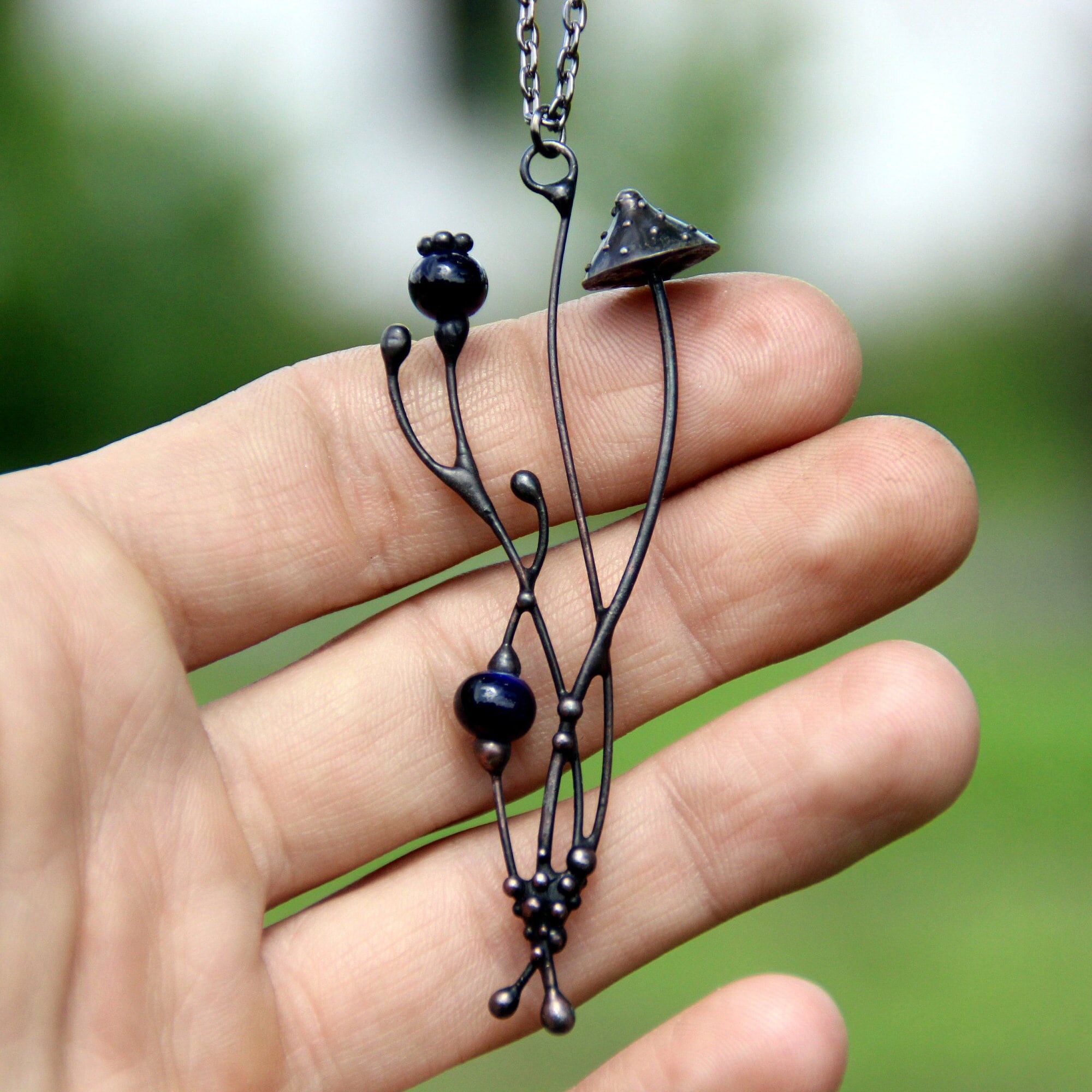 Small necklace Amanita mushroom with blue ceramic made from copper, pewter, steel, blue ceramic. The pendant is light and strude. All elements are handmade, which ensures the individuality of each product made in the Yadovito workshop. The copper alloy is coated with a black patina to color the metal black, polished with a finishing solution to give the jewelry a noble appearance and at the same time so that the metal does not oxidize. Each jewelry looks individually, because mushroom caps are made by hand, and not cast or stamped. Size about 7/3 cm (2.7 * 1.1 in). Color Black.